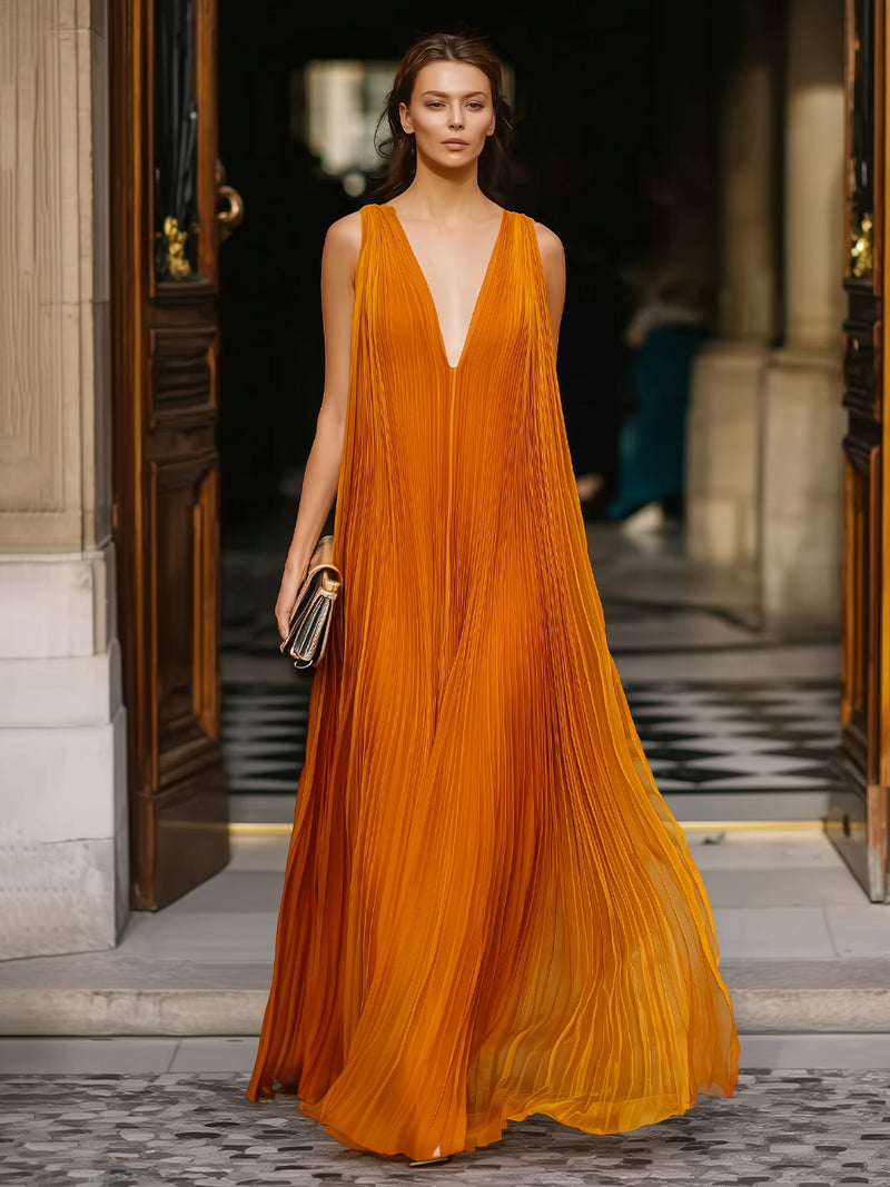 Sheer Pleated Sleeve Deep V Tailored Midi Dress