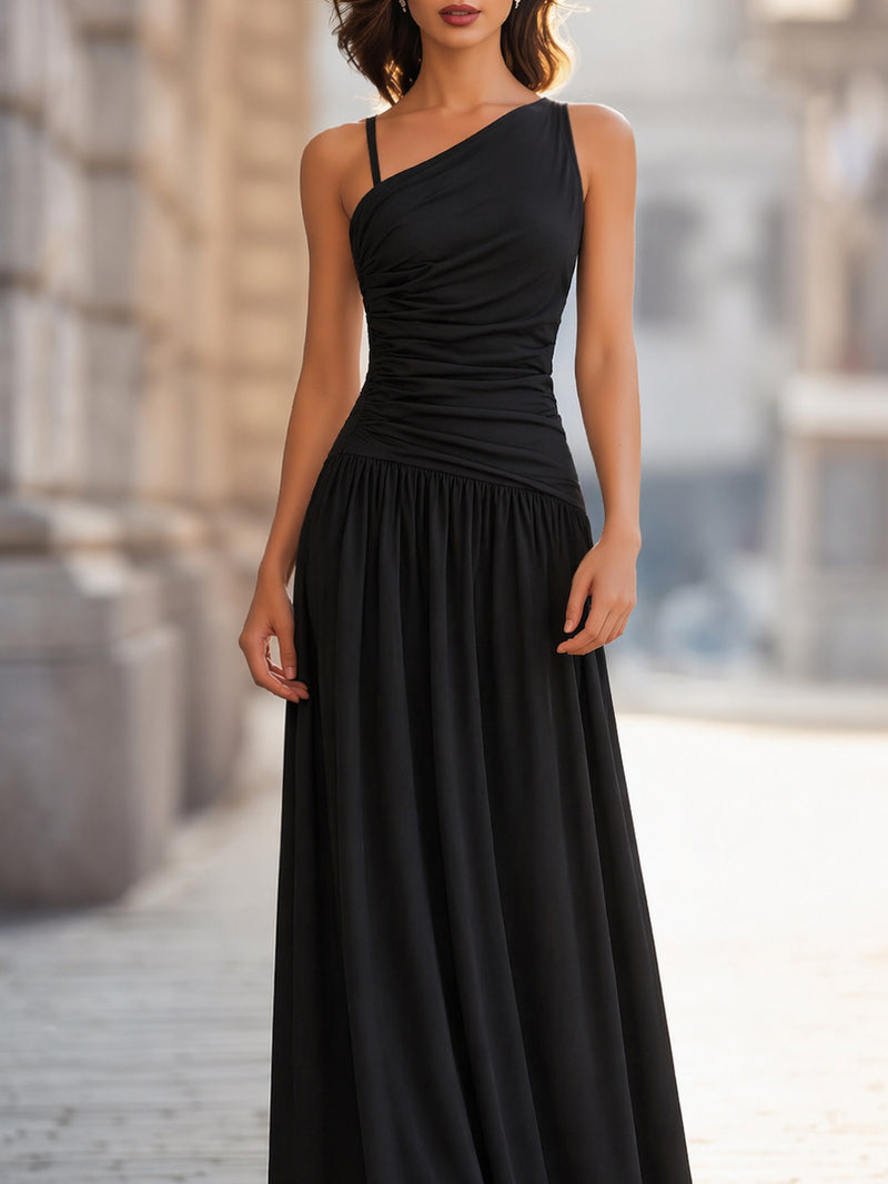 One-Shoulder Ruched Bodice Flowing Maxi Dress