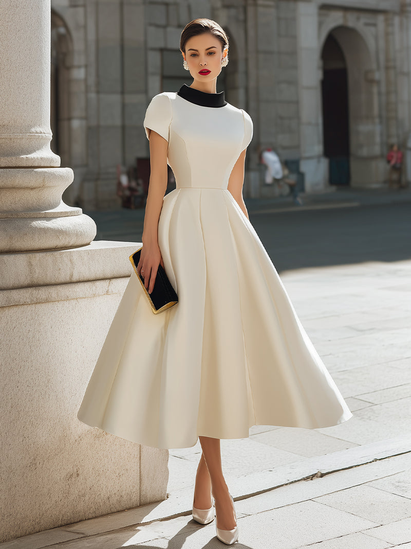 Contrast Collar Fit-and-Flare Midi Dress
