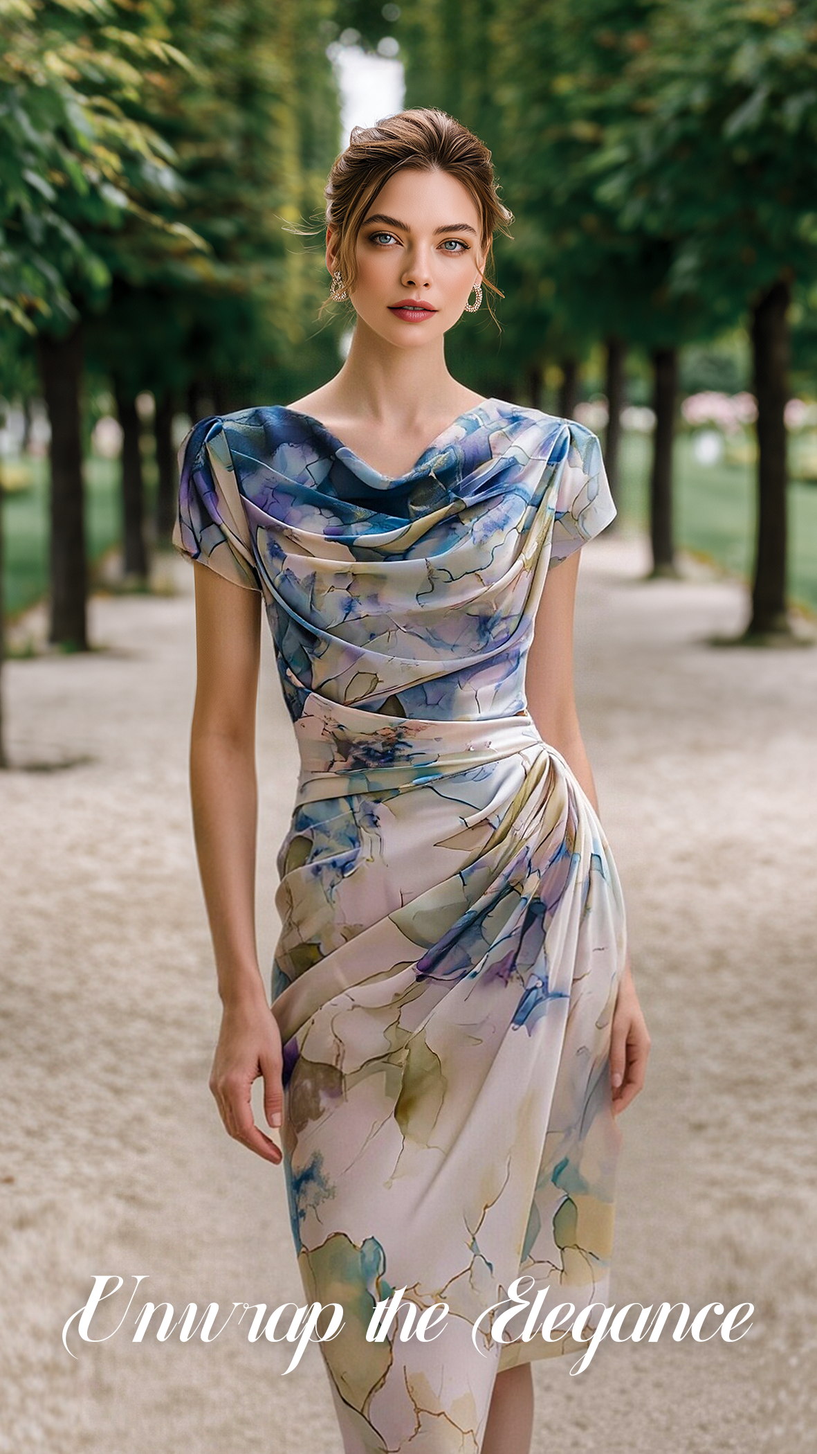Draped Cowl-Neck Print Midi Dress