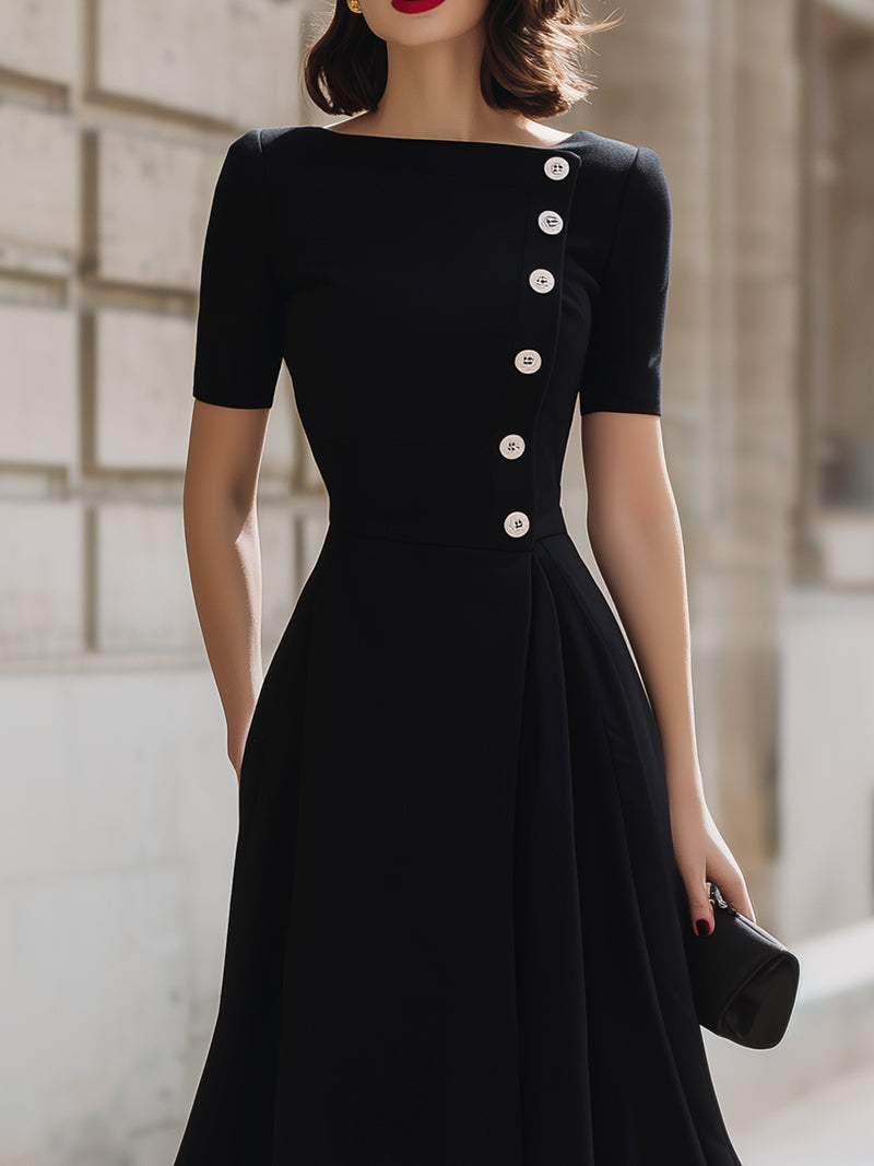 Black Boat Neck Short Sleeve Fit-and-Flare Midi Dress