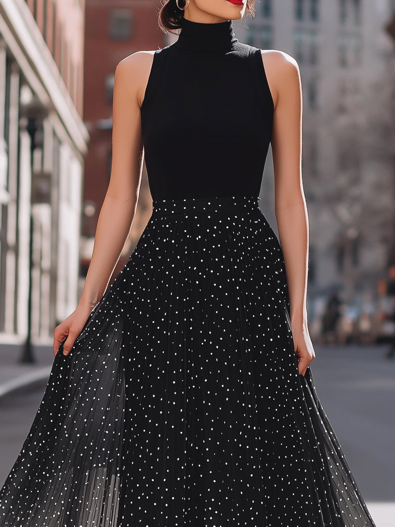 Sleeveless High-Neck Polka Dot Chiffon Maxi Dress