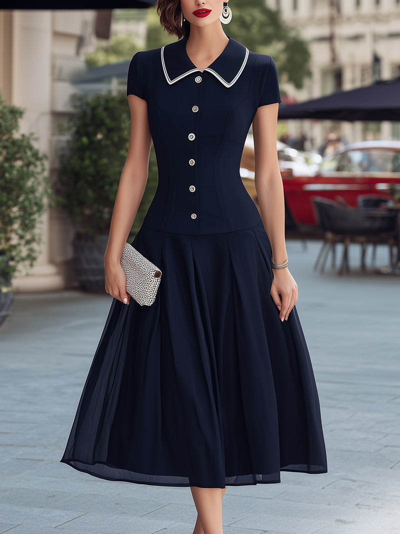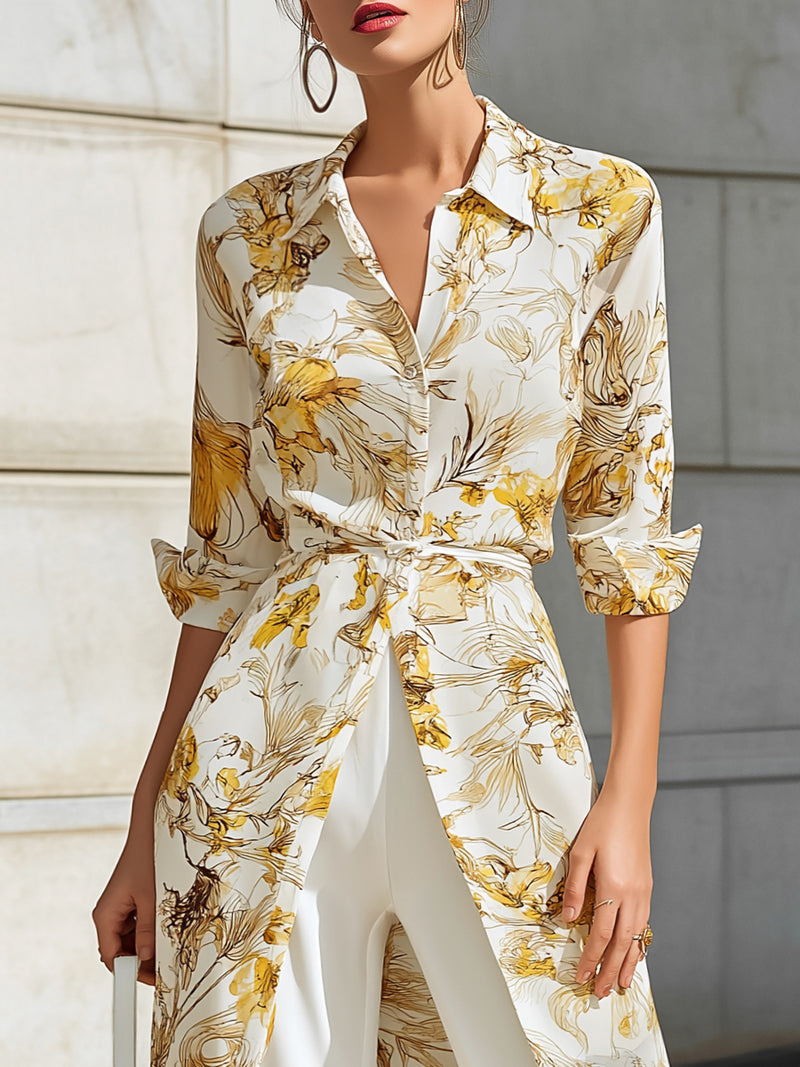 Floral Lapel Short Sleeve Midi Dress With Tailored Waist