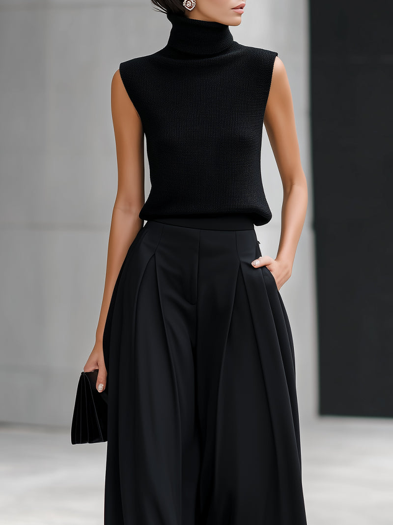 Black Turtleneck Sleeveless Knit Top & Pleated Wide-Leg Trouser Two-Piece Set