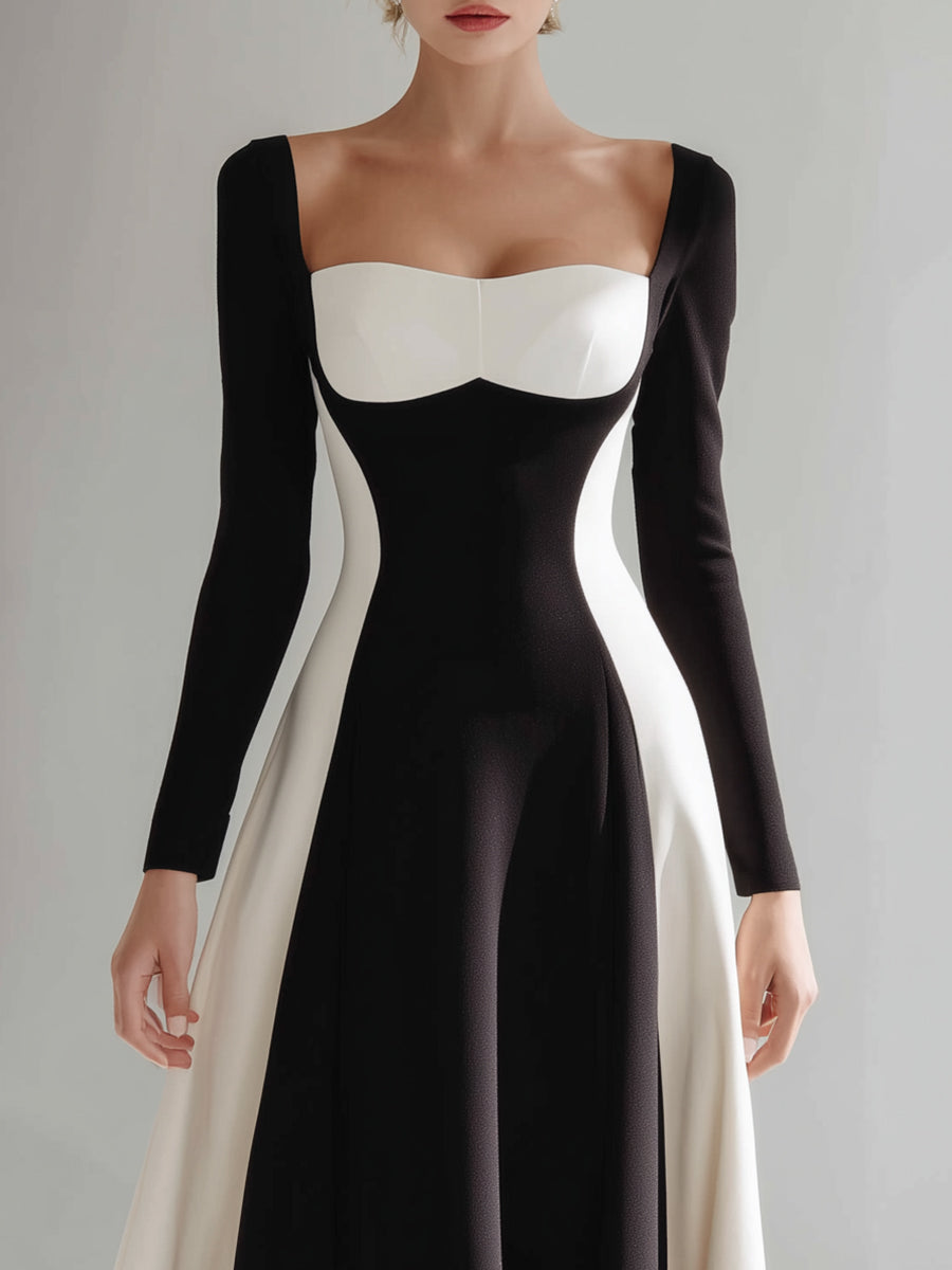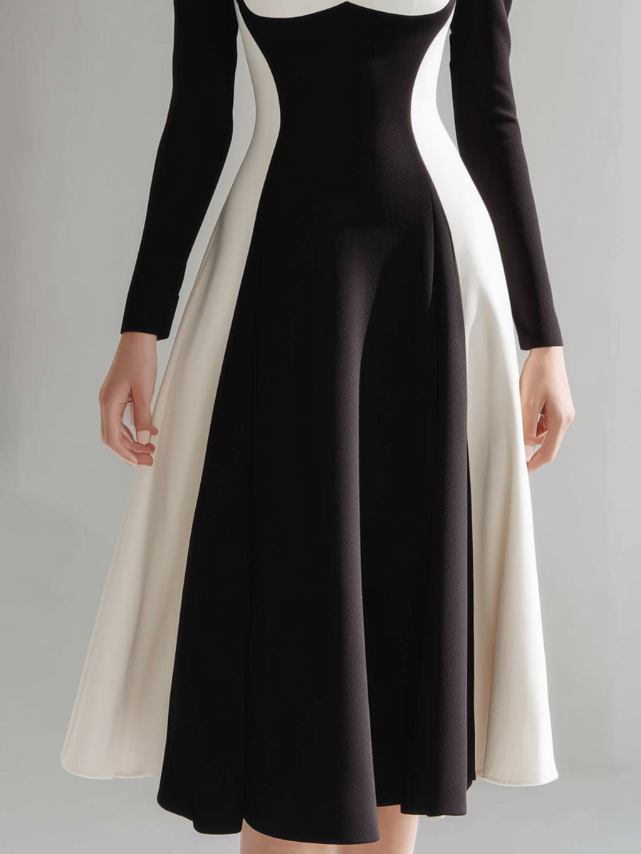 This black and ivory color-block midi dress is a refined statement of modern elegance, designed for women who appreciate sculptural tailoring and timeless contrast. The striking interplay of dark and light tones enhances the silhouette while delivering a polished, high-end aesthetic. The sweetheart neckline softly frames the décolletage, offering a feminine yet sophisticated appeal. Long fitted sleeves balance the open neckline, creating a harmonious proportion that feels both elegant and confident. Strategically placed ivory panels contour the waist and hips, visually sculpting the figure and enhancing natural curves.
