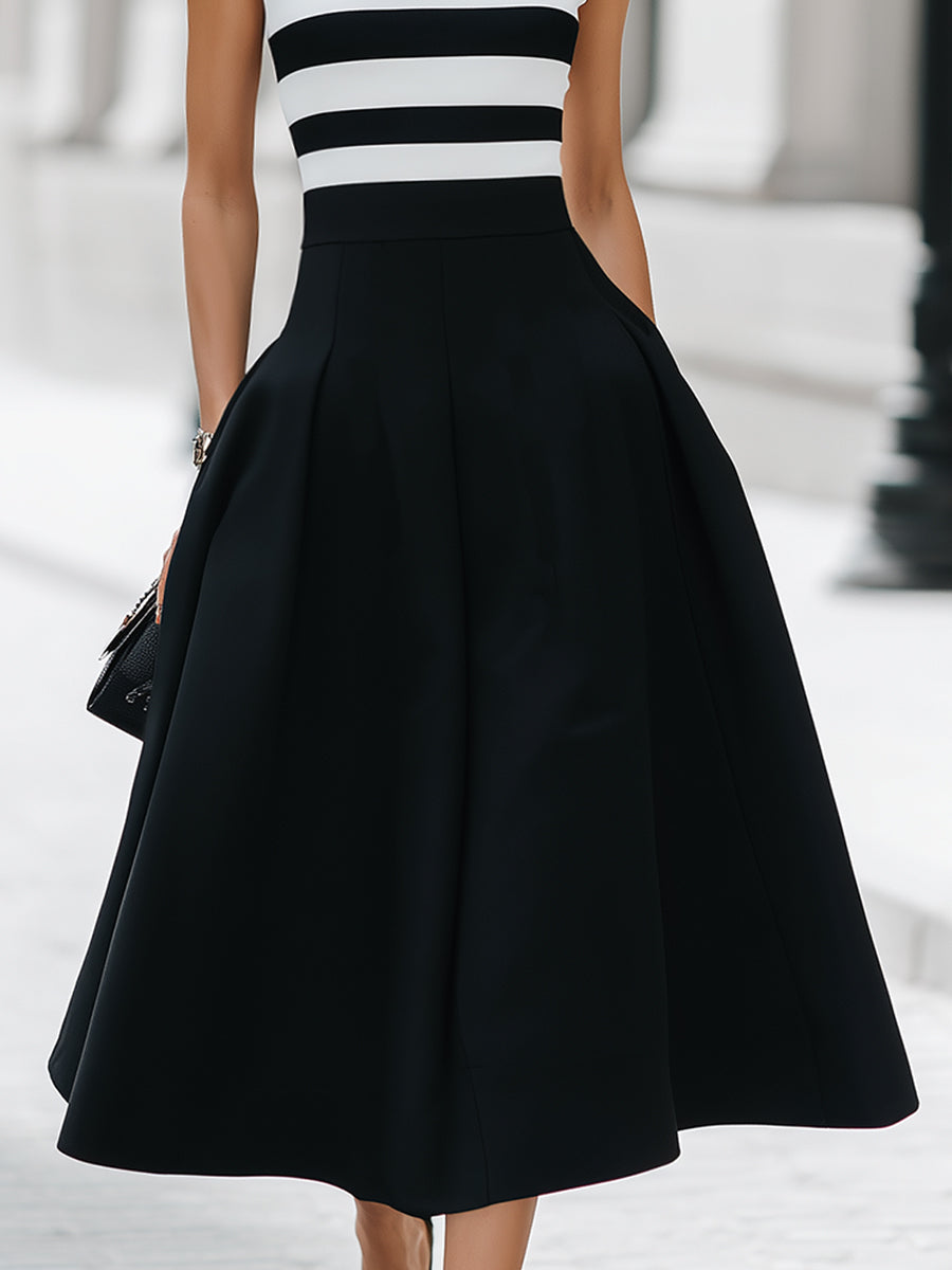 - Design: Sleeveless high neckline, horizontal black-and-white striped bodice, solid black pleated A-line midi skirt, and functional side pockets.