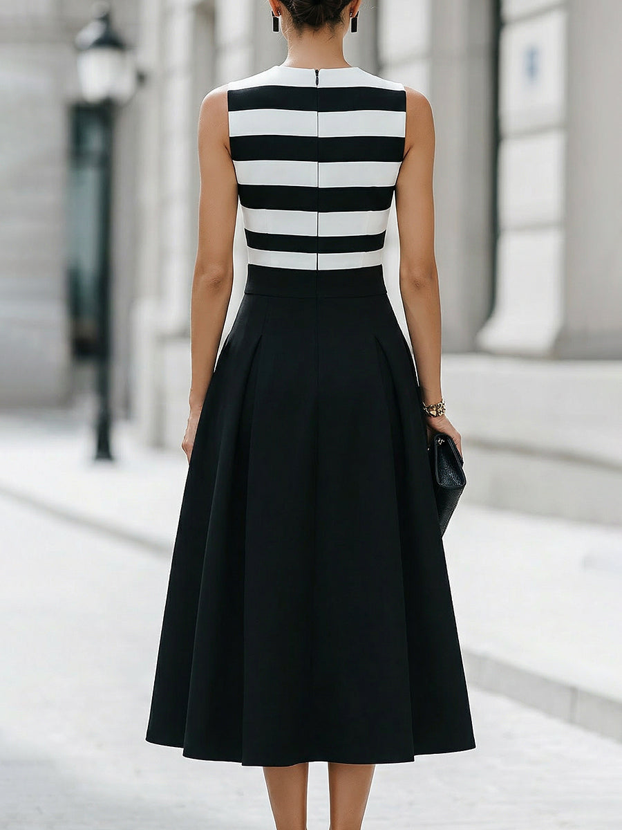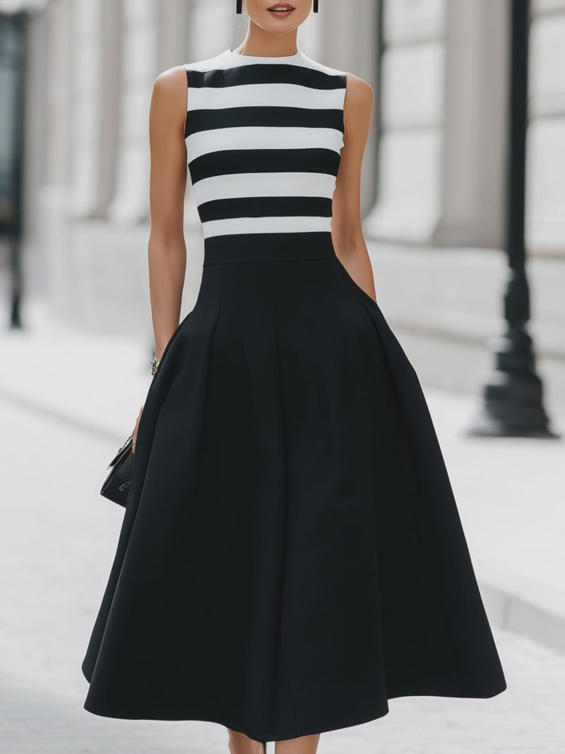This striking midi dress masterfully blends bold graphic design with timeless sophistication, making it a standout piece for any modern wardrobe. The upper bodice features crisp horizontal black-and-white stripes that create a structured, eye-catching pattern, while the clean high neckline and sleeveless cut lend a polished, contemporary edge.