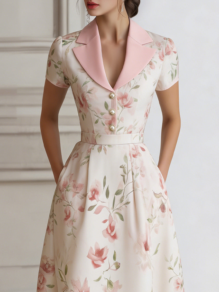 Floral Lapel Short Sleeve Midi Dress With Tailored Waist