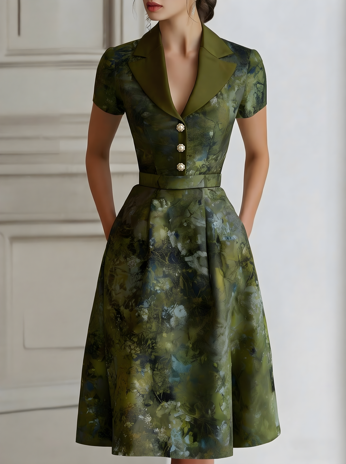 - Design:Lapel neckline, short sleeves, fitted waist, flared midi skirt, floral-patterned fabric