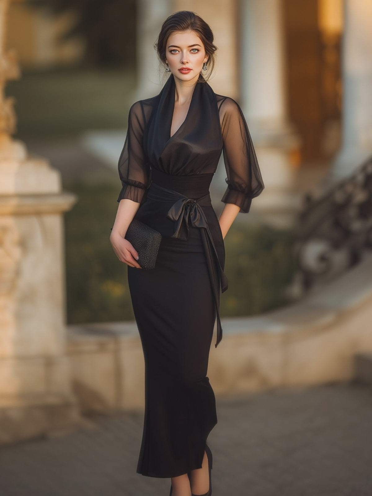 Designed with fluid draping and subtle transparency, this evening dress elevates classic formalwear with modern refinement. The sheer bodice and sleeves introduce an ethereal contrast to the structured waist, while the side-tie sash enhances the silhouette with sculptural elegance. The long, streamlined skirt ensures a graceful presence for any formal setting, making this dress an essential choice for women who appreciate timeless sophistication paired with contemporary detailing.