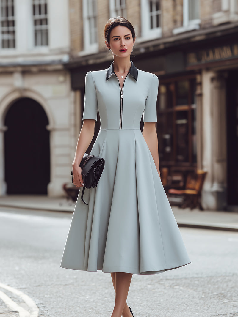 Zip Front Collared A-Line Midi Dress