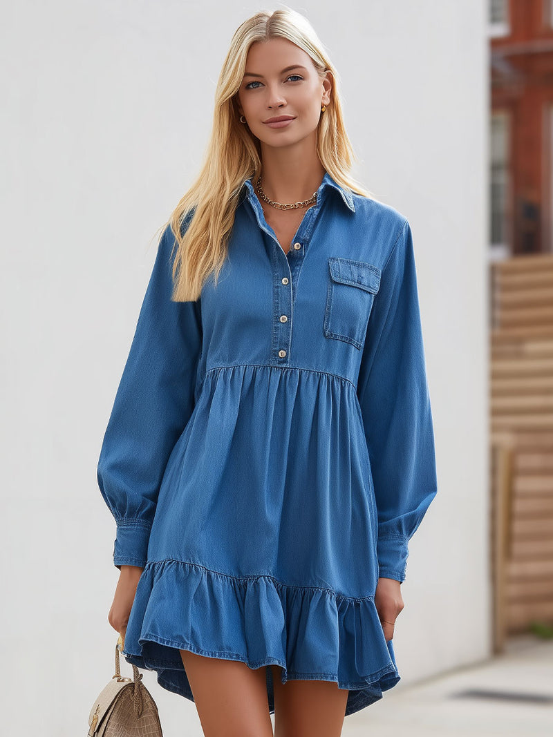 Denim Shirt Dress With Ruffled Hem & Puff Sleeves
