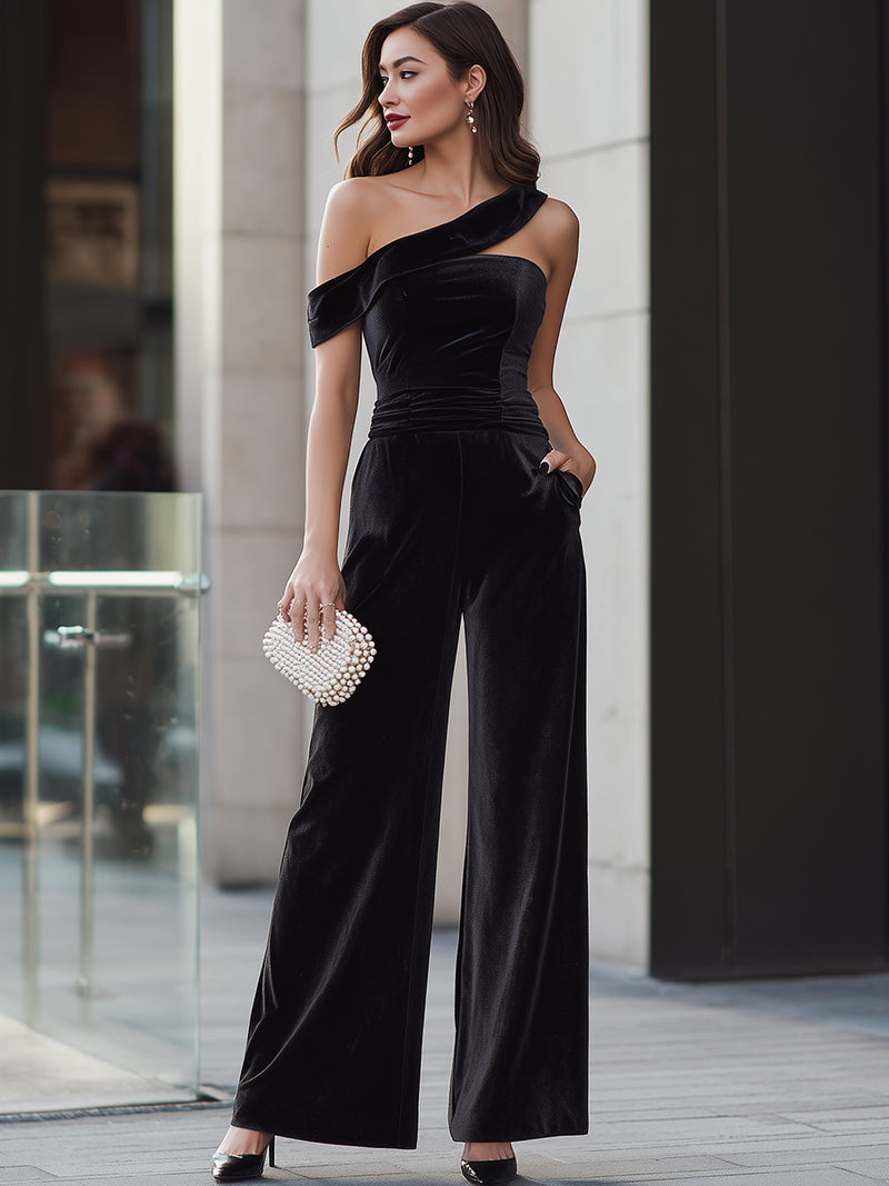 Elegant One-Shoulder Velvet Wide-Leg Jumpsuit