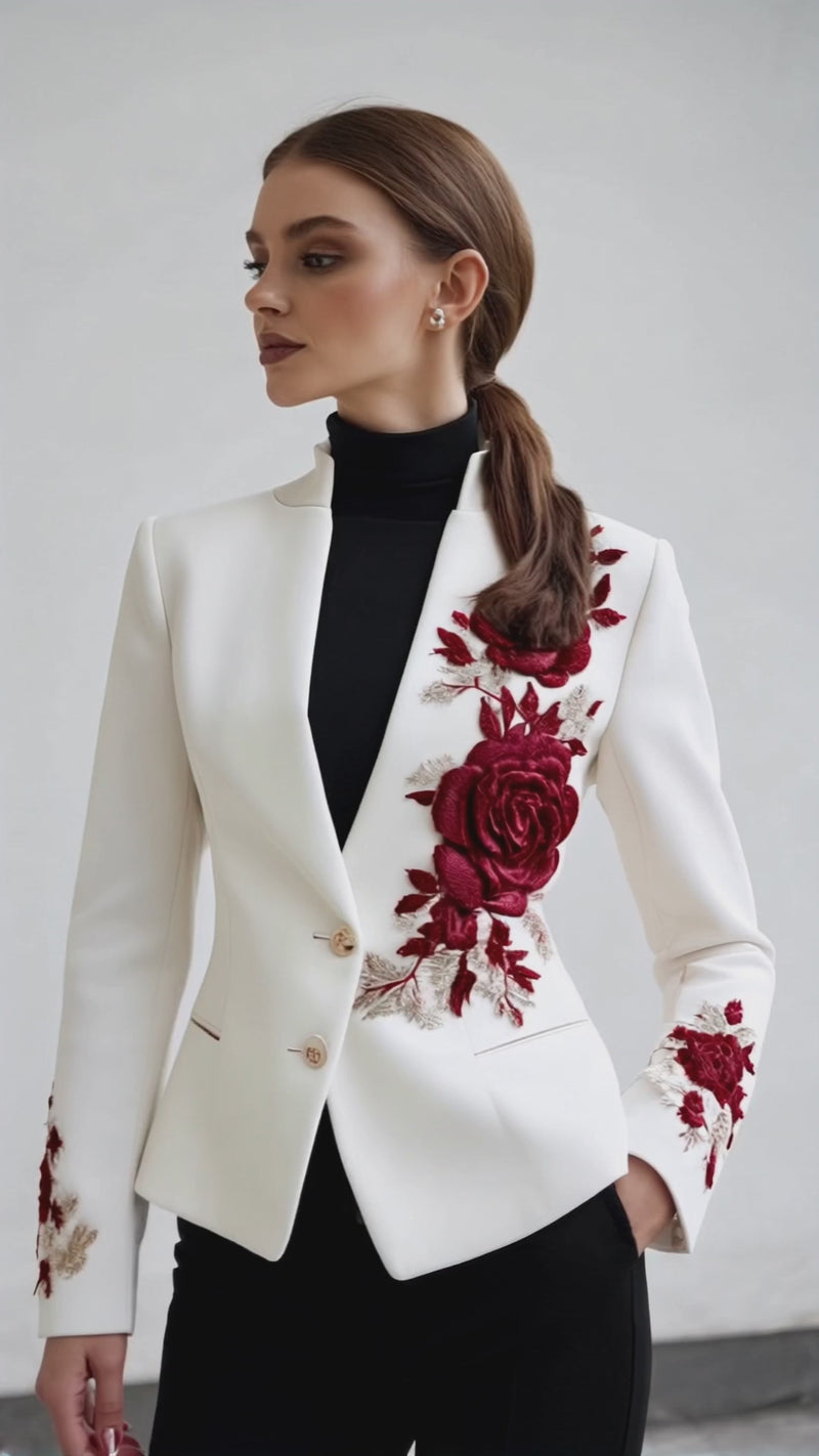 Elegant Asymmetrical White Blazer with Black Contrast Lapels