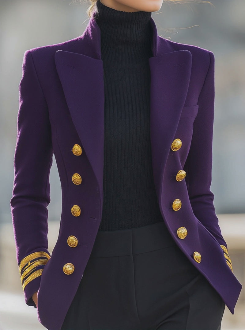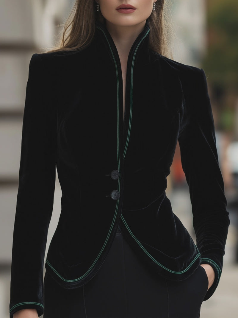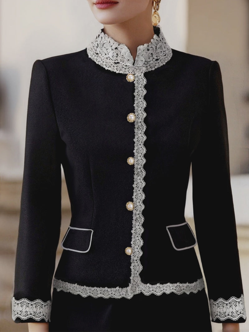 Elegant Pearl Button Blazer With Contrast Lace Trim
