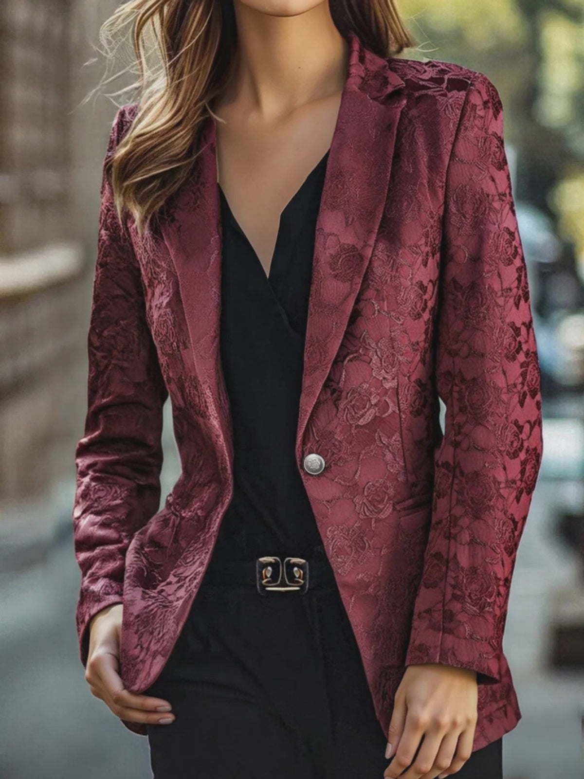 Burgundy Floral Jacquard Single-Breasted Blazer