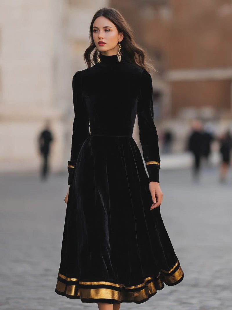 Elegant Velvet Midi Dress With Gold Trim