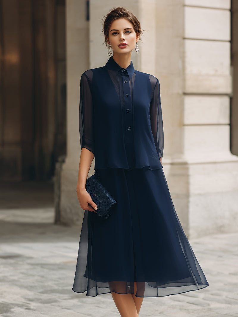 Satin Shirt and Navy Pencil Skirt Set for Modern Office Chic