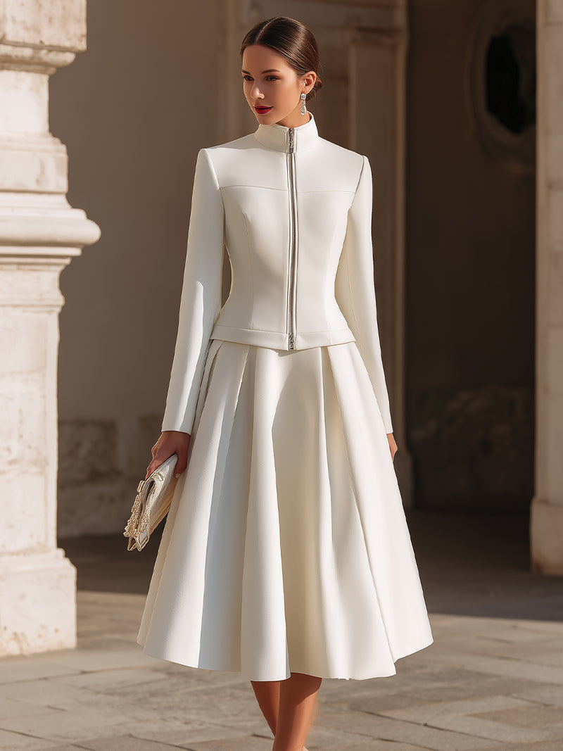 Stand Collar Zip-Up Jacket And Pleated Midi Skirt Set