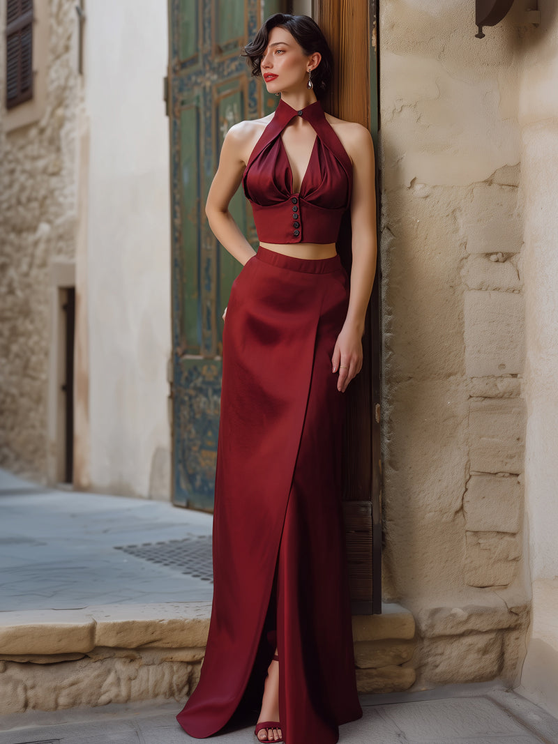 Sophisticated Satin Two-Piece Halter Set - Cropped Vest And Maxi Skirt