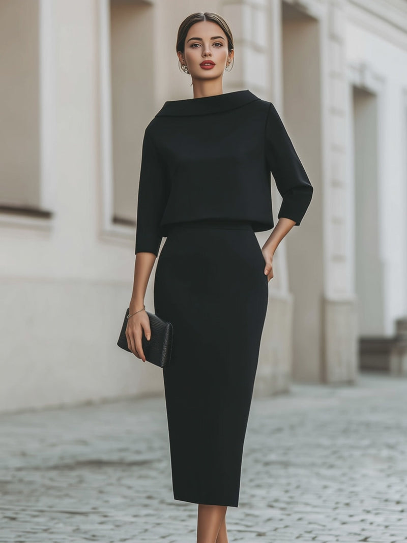 Mooyius presents a refined two-piece skirt set that embodies understated elegance through clean lines and precise tailoring. This coordinated design features a structured boat-neck top paired with a sleek midi skirt, creating a harmonious silhouette that feels both modern and timeless. The top is designed with a relaxed yet polished shape, enhanced by three-quarter sleeves that add balance and sophistication. The matching midi skirt sits neatly at the waist and falls in a straight, elongated line, offering a streamlined and confident finish. Together, the set delivers effortless coordination with a strong sense of architectural simplicity.