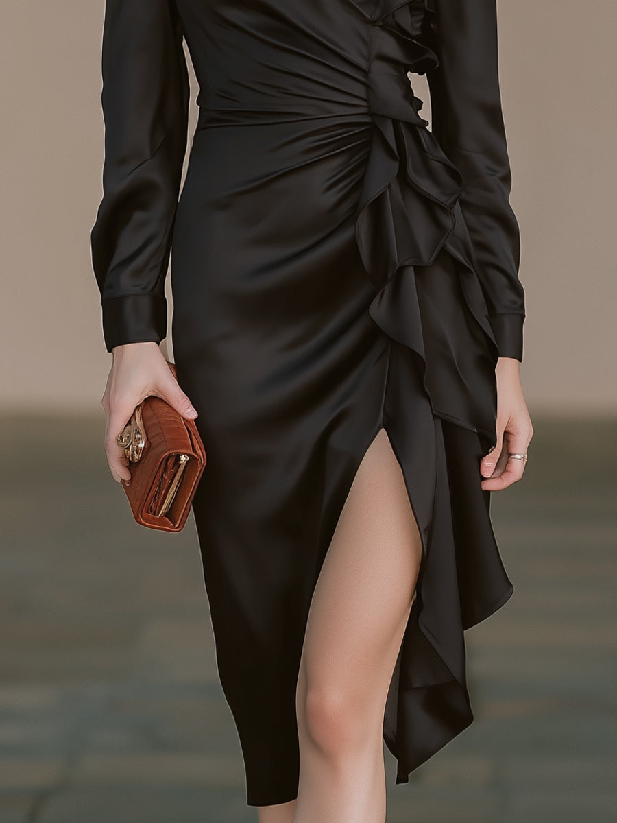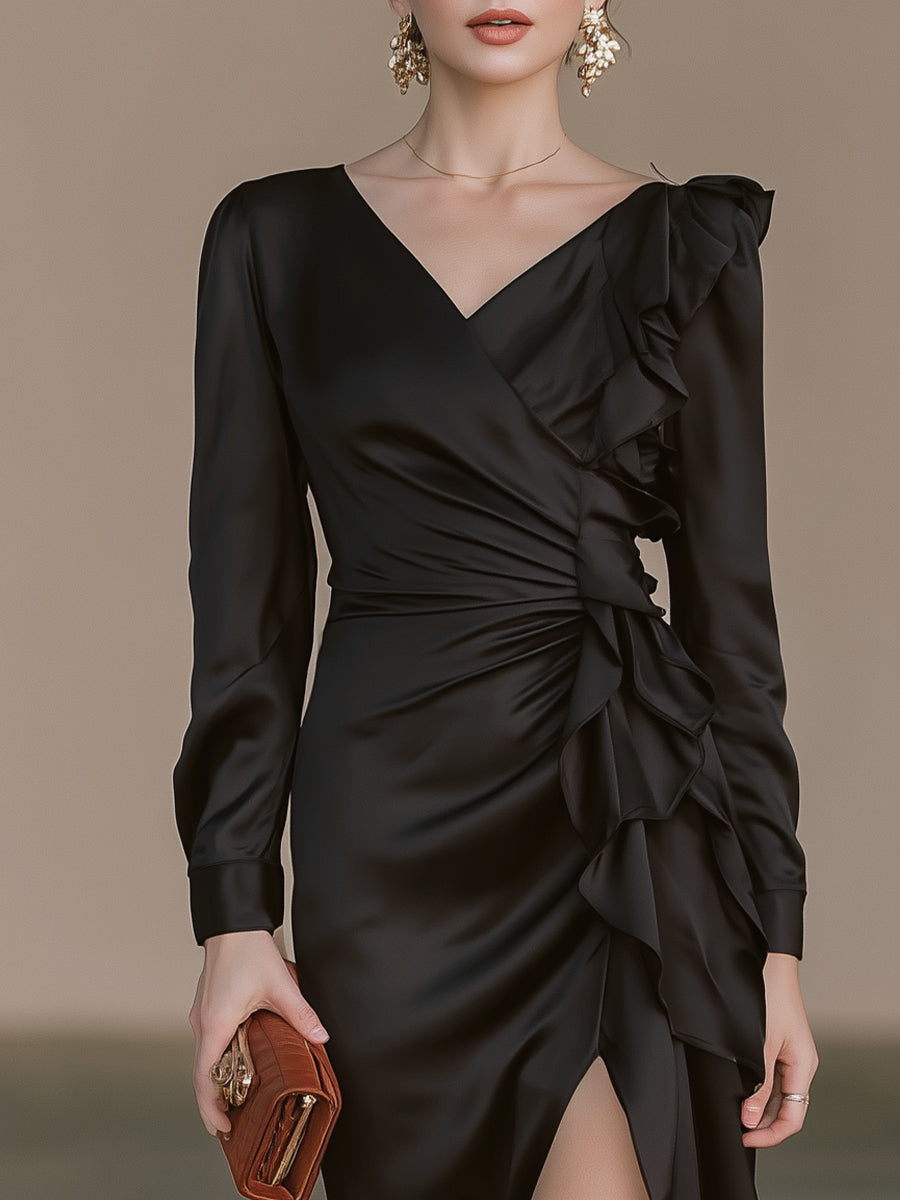 Mooyius presents a refined wrap-style dress designed with sculptural ruffles and a modern asymmetric silhouette. This elegant piece features a clean V-neckline that elongates the neckline, complemented by long sleeves for balanced sophistication. Soft gathering enhances the waist, leading into a cascading series of layered ruffles along one side, adding dimension and graceful movement. The wrap-inspired skirt finishes with an asymmetric hem and a refined slit for effortless allure.