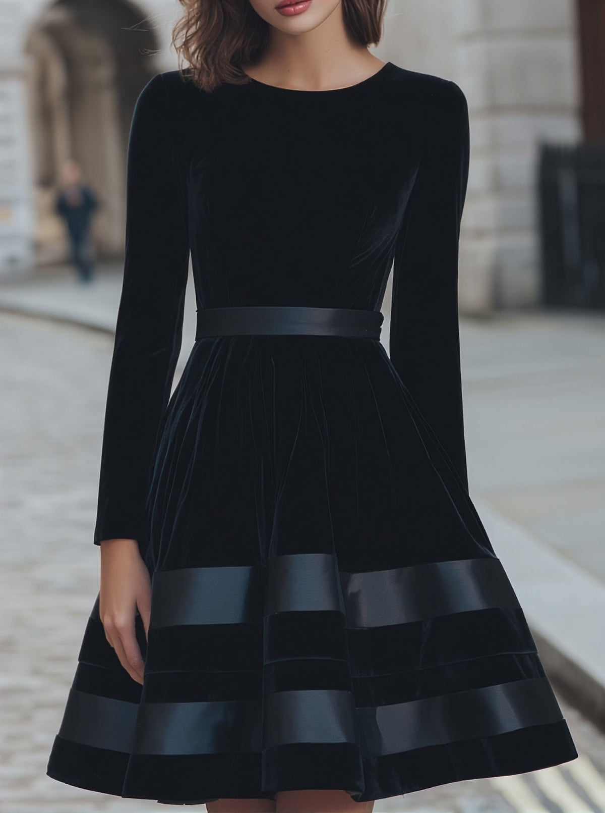 Black Velvet Fit-and-Flare Dress With Satin Stripes