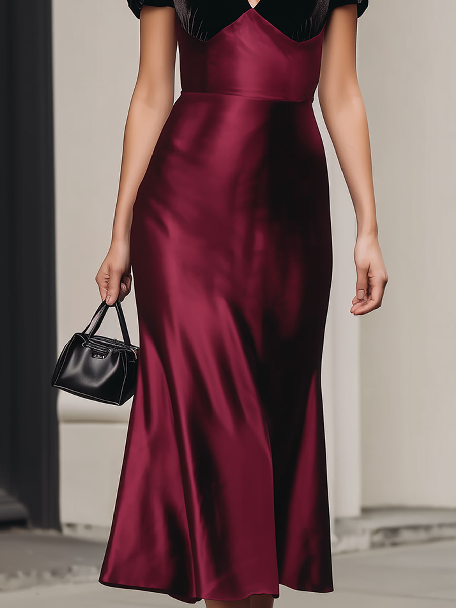 Designed for the woman who loves luxurious contrast and romantic flair, this burgundy midi dress merges glossy satin with plush velvet details. The deep V-neckline is framed by black velvet puffy short sleeves, adding soft volume and a dramatic, elegant edge. The smooth satin fabric drapes into a form-fitting silhouette that flows into a gentle A-line midi hem, balancing structure with effortless movement.