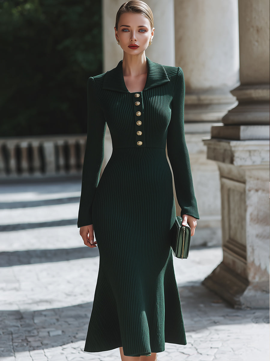 Mooyius presents a refined midi dress that blends sculptural knit texture with elegant tailoring for a timeless, feminine silhouette. This sophisticated design features a structured collar neckline that frames the upper body with polished confidence, complemented by long sleeves that offer sleek coverage and balance. The vertically ribbed construction enhances the streamlined profile, visually elongating the figure while emphasizing natural curves. A row of decorative buttons at the front adds classic charm and subtle detail, while the gently flared hem introduces graceful movement, completing the look with understated elegance.