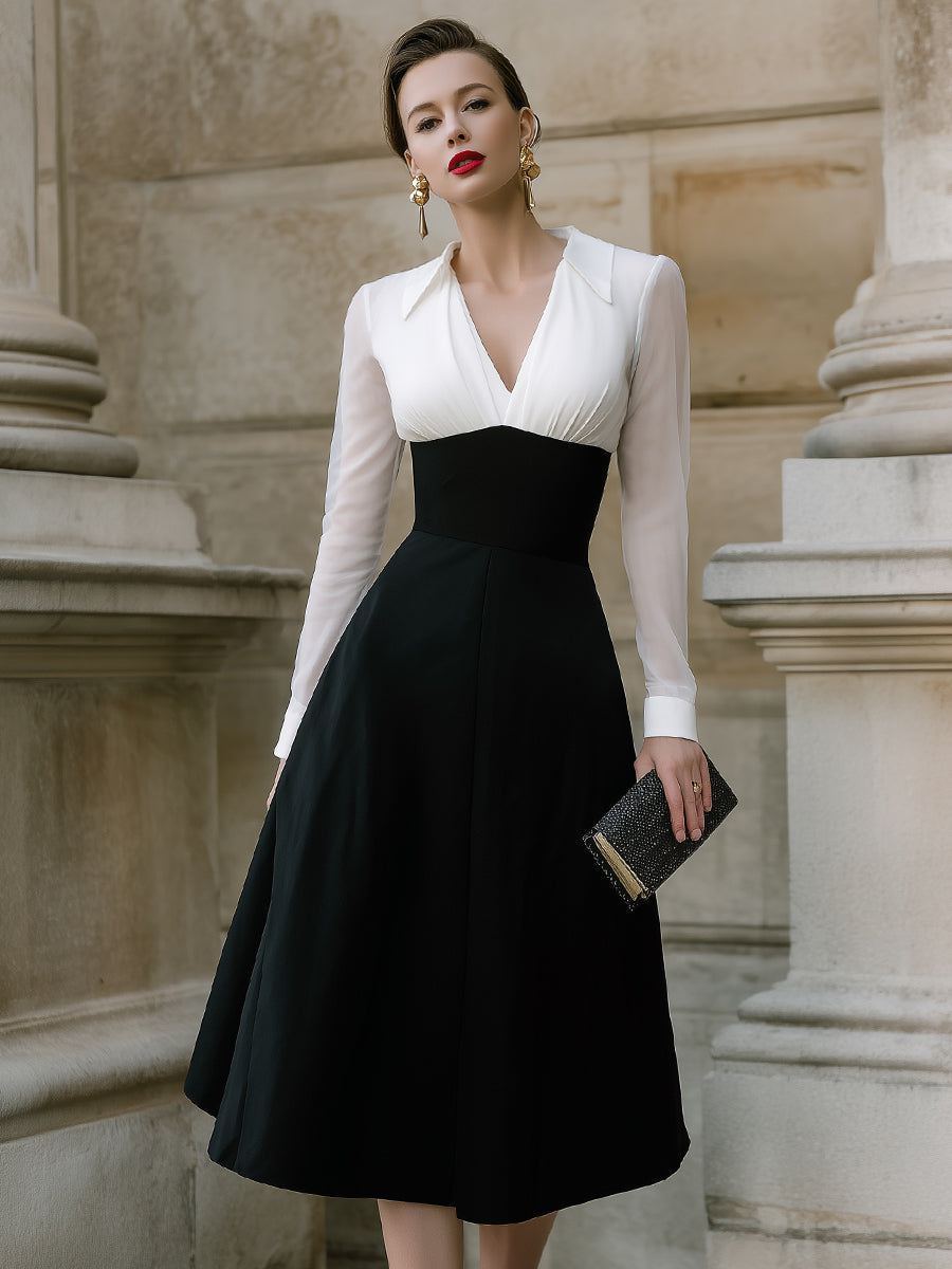 Mooyius presents a polished midi dress that blends refined tailoring with timeless femininity. The design features a wrapped V-neck bodice contrasted by sheer long sleeves and a structured collar, offering an elevated interpretation of classic styling. A wide, sculpting waistband defines the silhouette before transitioning into a gracefully flared A-line skirt that moves with understated elegance.