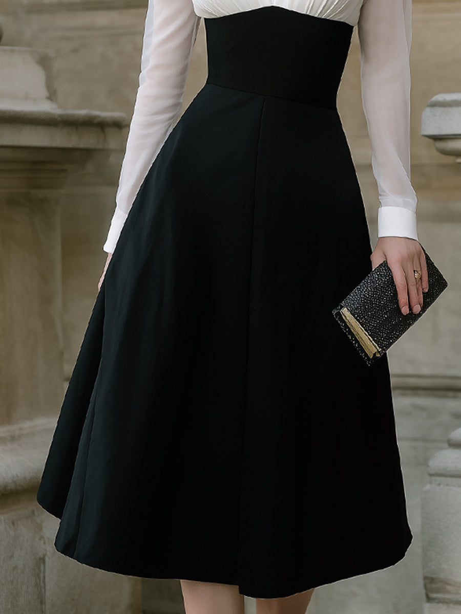 Crafted for the woman who values refined contrast and impeccable structure, this midi dress delivers a harmonious balance of softness and precision. The sheer sleeves introduce delicate dimension, while the defined waist and flowing skirt create a universally flattering silhouette suitable for a range of elevated occasions.