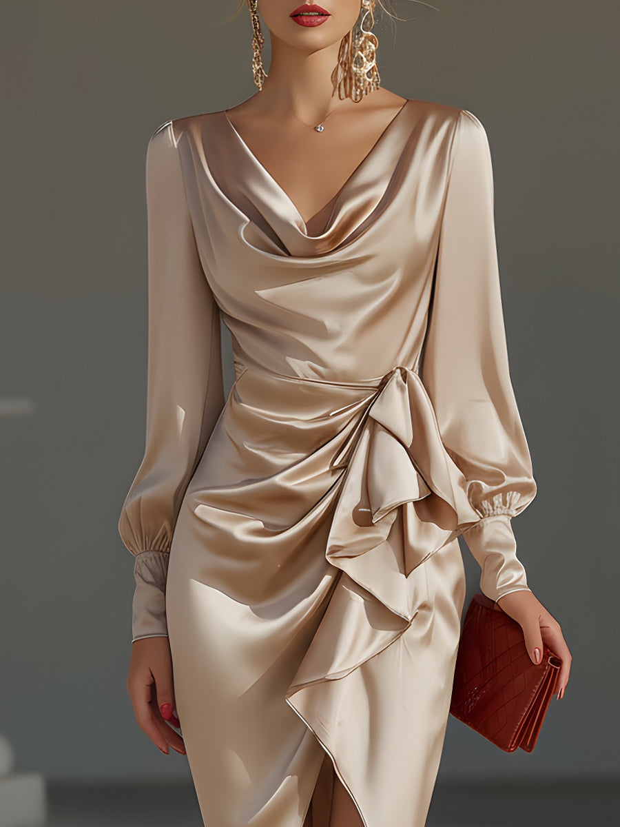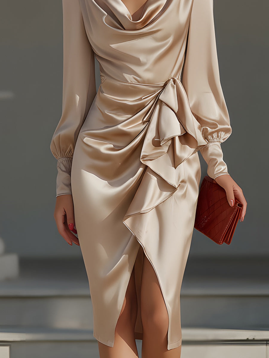 Mooyius presents an elegant sheath dress designed to highlight soft draping and sculptural femininity. This sophisticated style features a fluid cowl neckline that frames the décolletage with graceful ease, paired with long sleeves finished in subtly gathered cuffs for a refined silhouette. The waist is enhanced by an artfully layered side ruffle, creating a cascading effect that adds movement and visual interest. A wrap-inspired skirt completes the design with a gentle front slit for poised allure.