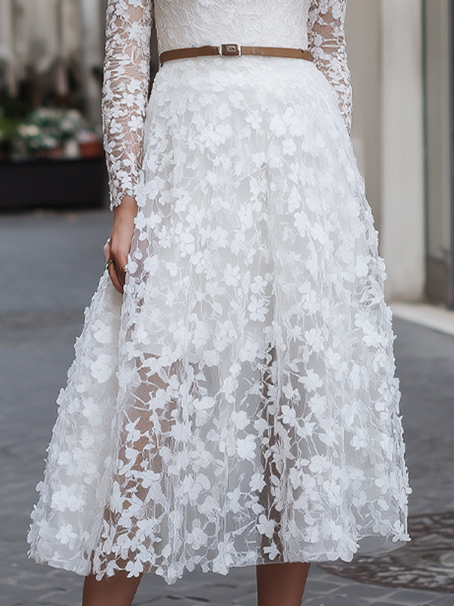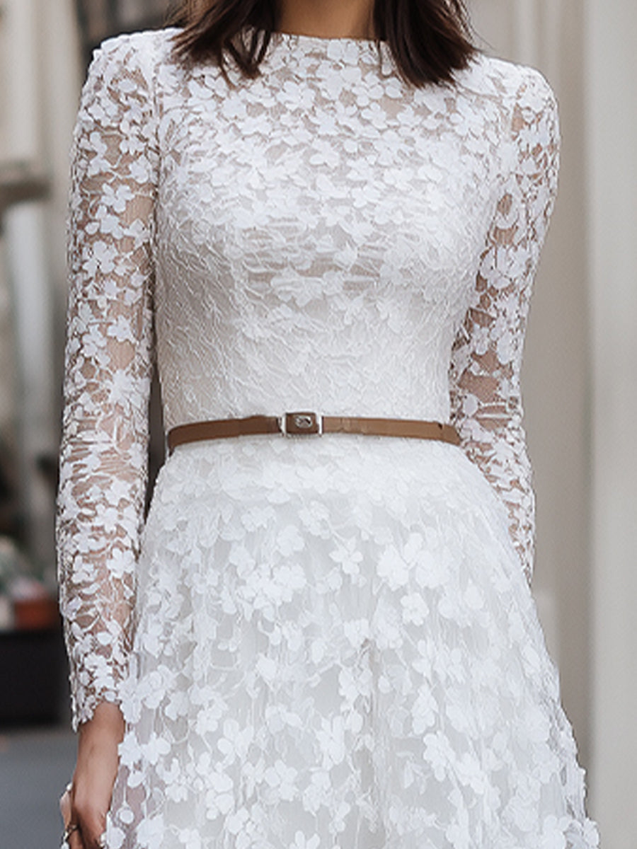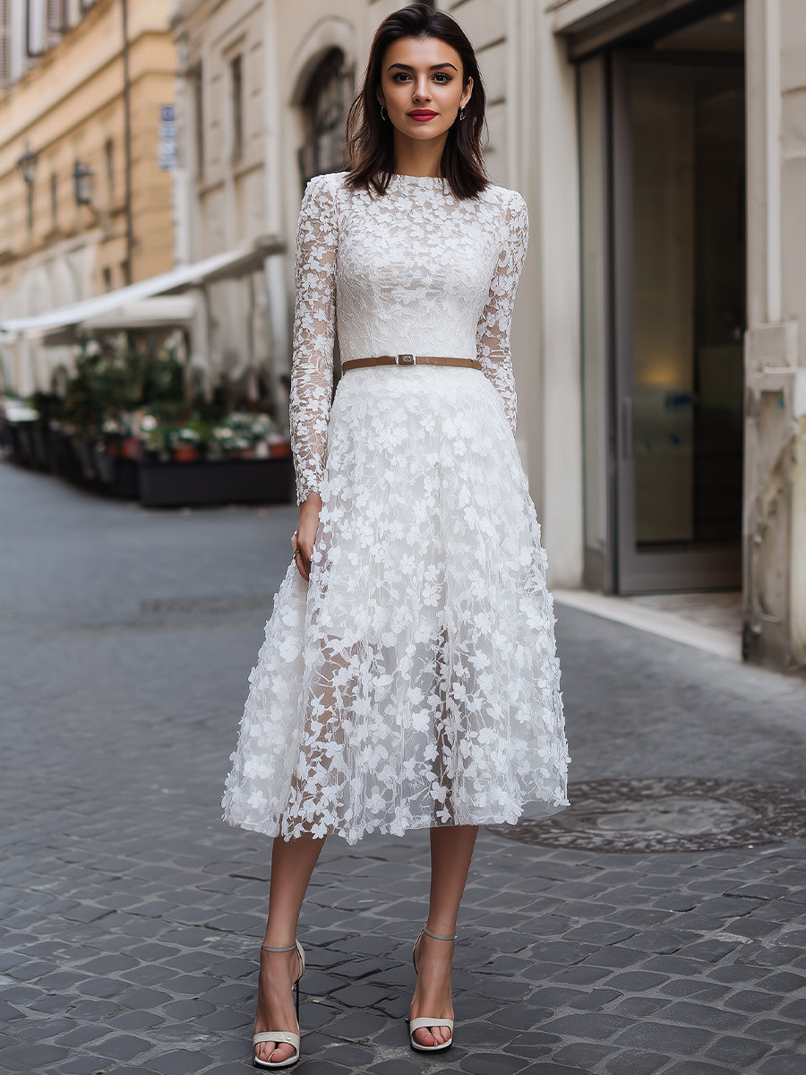 This Floral Lace Long-Sleeve Midi Dress captures the essence of timeless femininity with a modern, romantic twist. Crafted in soft white lace, the dress features an intricate allover floral pattern that brings depth, charm, and delicate texture to the silhouette. The fitted bodice and sheer long sleeves create a graceful, refined upper profile, while the midi-length skirt flows beautifully with every step.