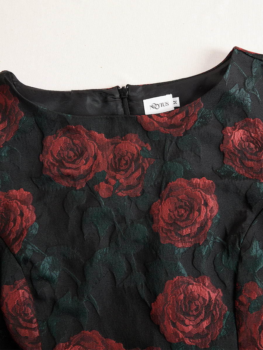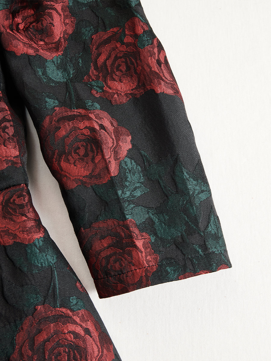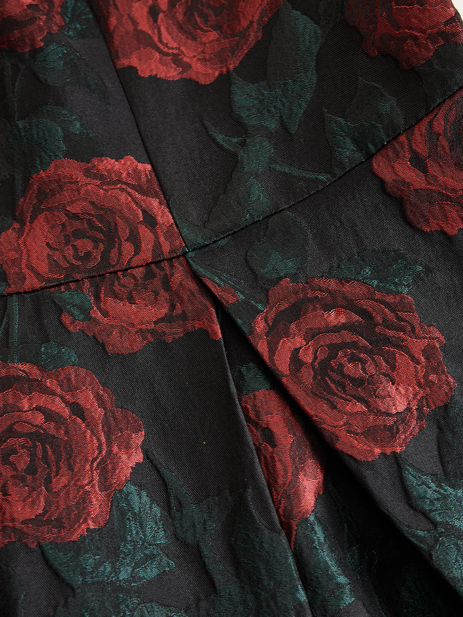 This Black Jacquard Rose Print Midi Dress radiates romantic sophistication, blending timeless tailoring with bold floral artistry. The deep black base sets the stage for vivid red roses and muted green leaves, intricately woven into the fabric for a luxurious textured effect.