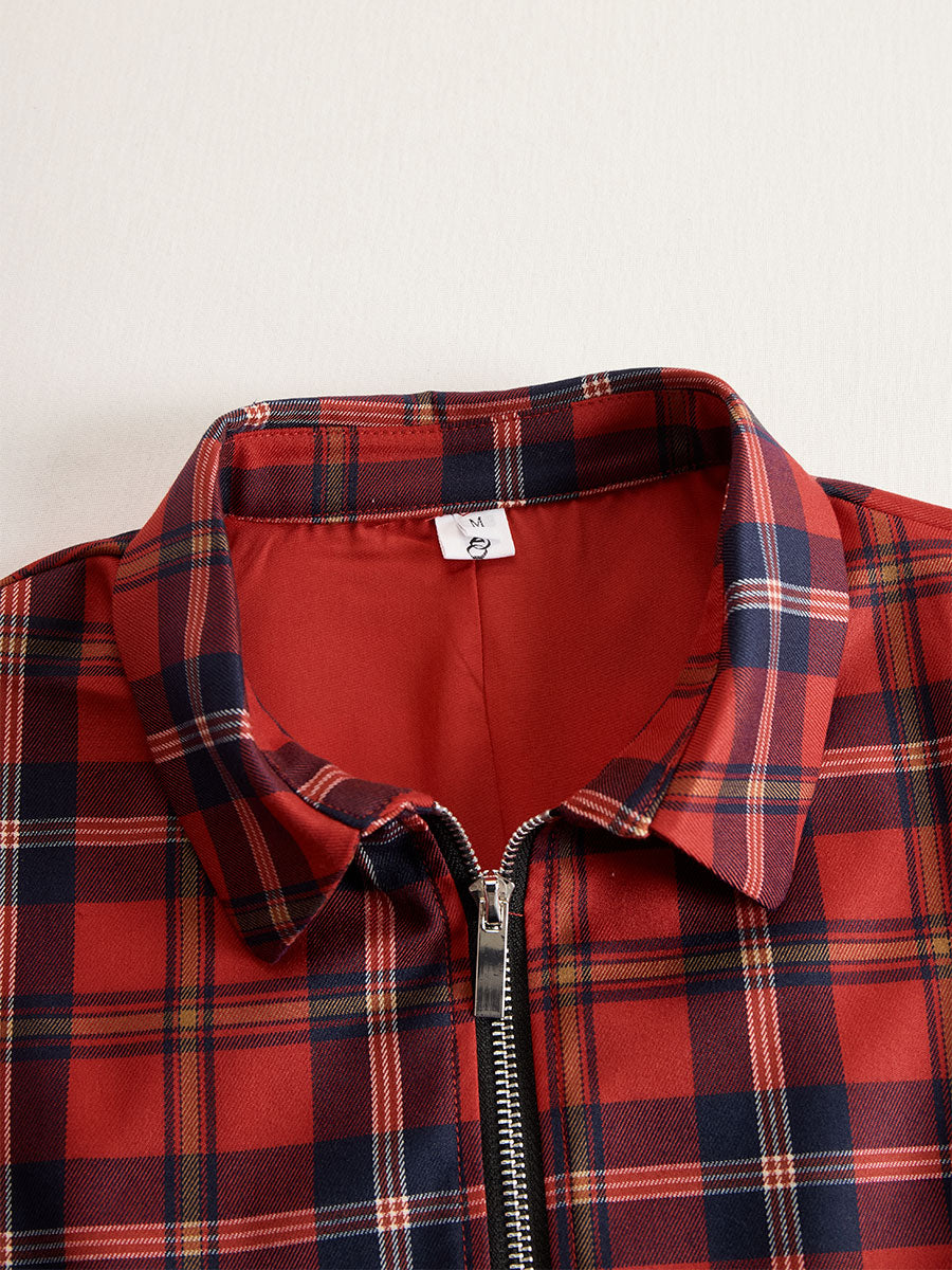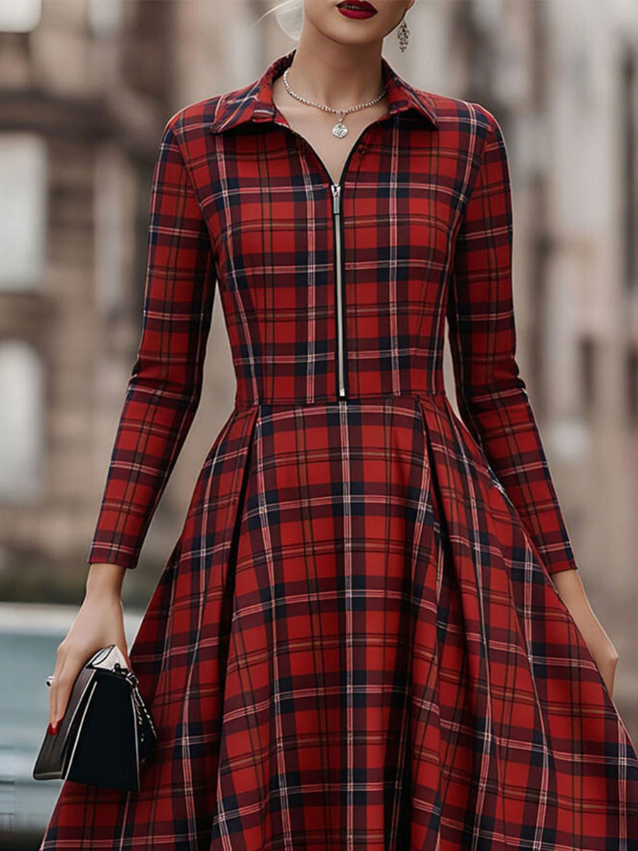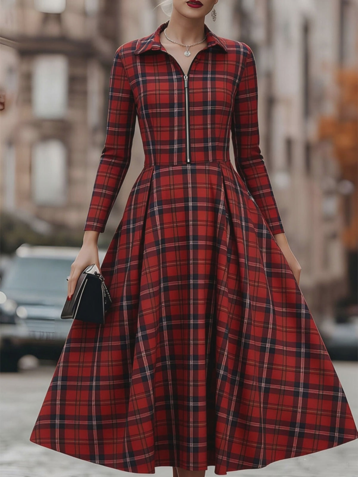 Mooyius presents the Elegant Red Plaid Midi Dress, designed for the modern woman with a penchant for vintage-inspired glamour. The dress features a bold red plaid pattern, a collared neckline with a front zipper, and a voluminous flared skirt for a touch of retro-chic elegance. With its long sleeves and tailored silhouette, this dress effortlessly blends classic charm with contemporary style.