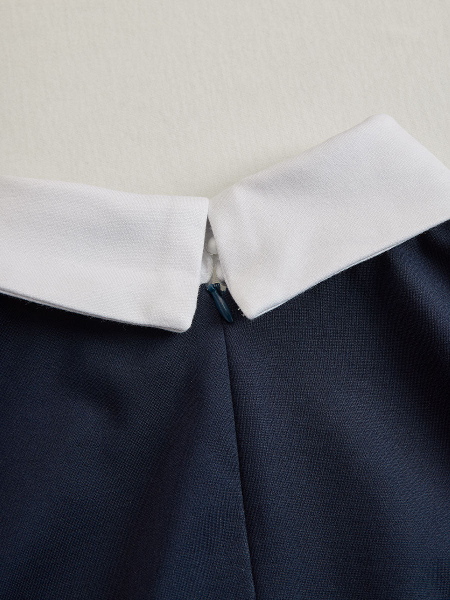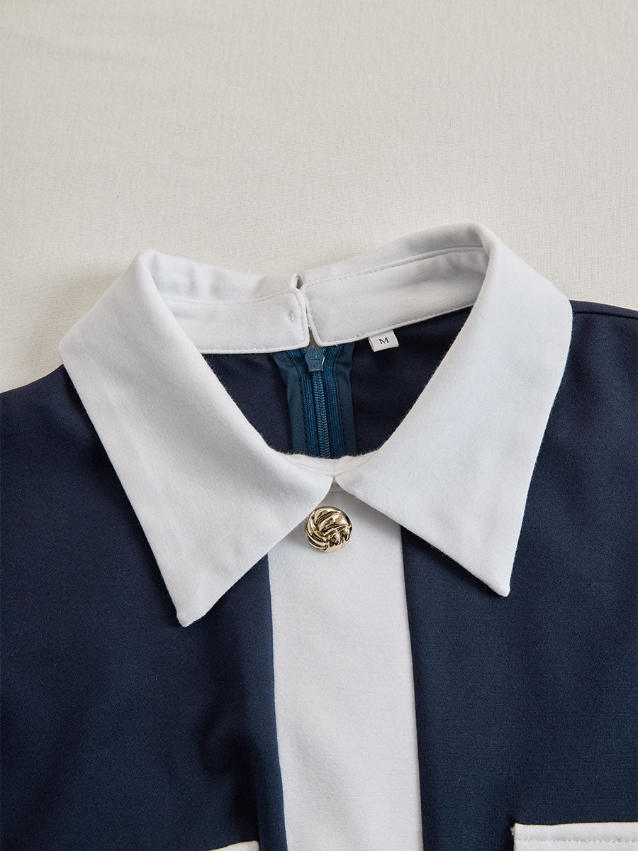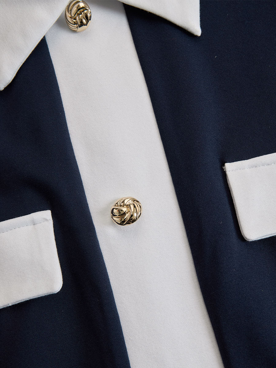 Mooyius presents the sophisticated navy midi dress, featuring striking white contrast detailing and gold-tone buttons. Designed with a flattering tailored silhouette, this dress exudes elegance and confidence — perfect for business meetings, formal lunches, or elevated everyday wear. The structured collar and functional pocket flaps finish the look with timeless charm.