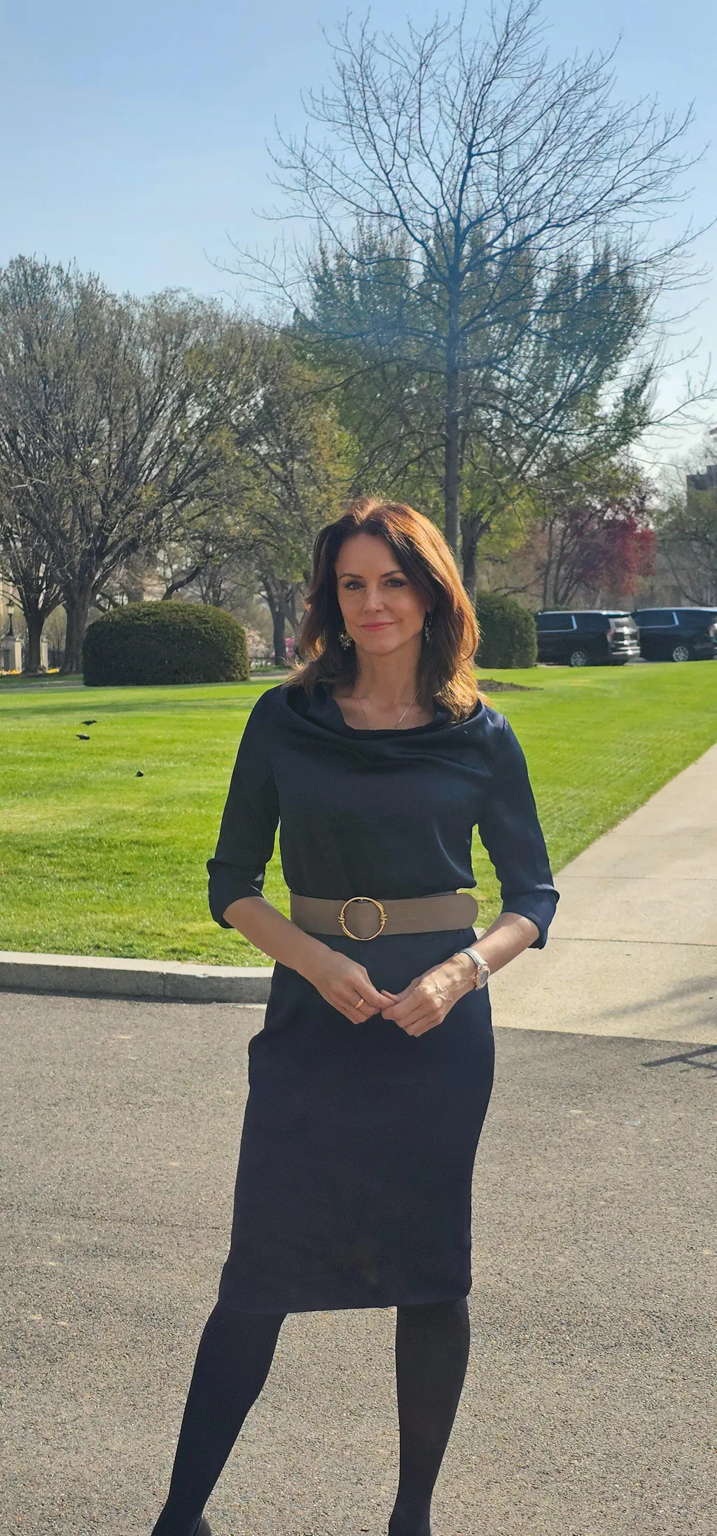 - Design: Draped-collar satin midi dress with structured shirt neckline, three-quarter sleeves, and black waist belt
