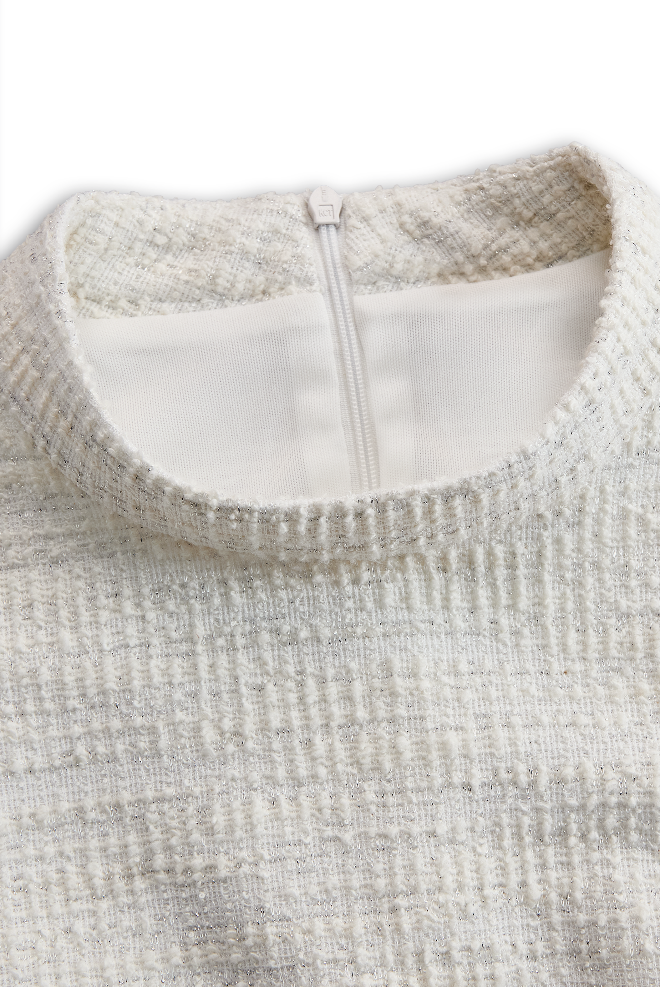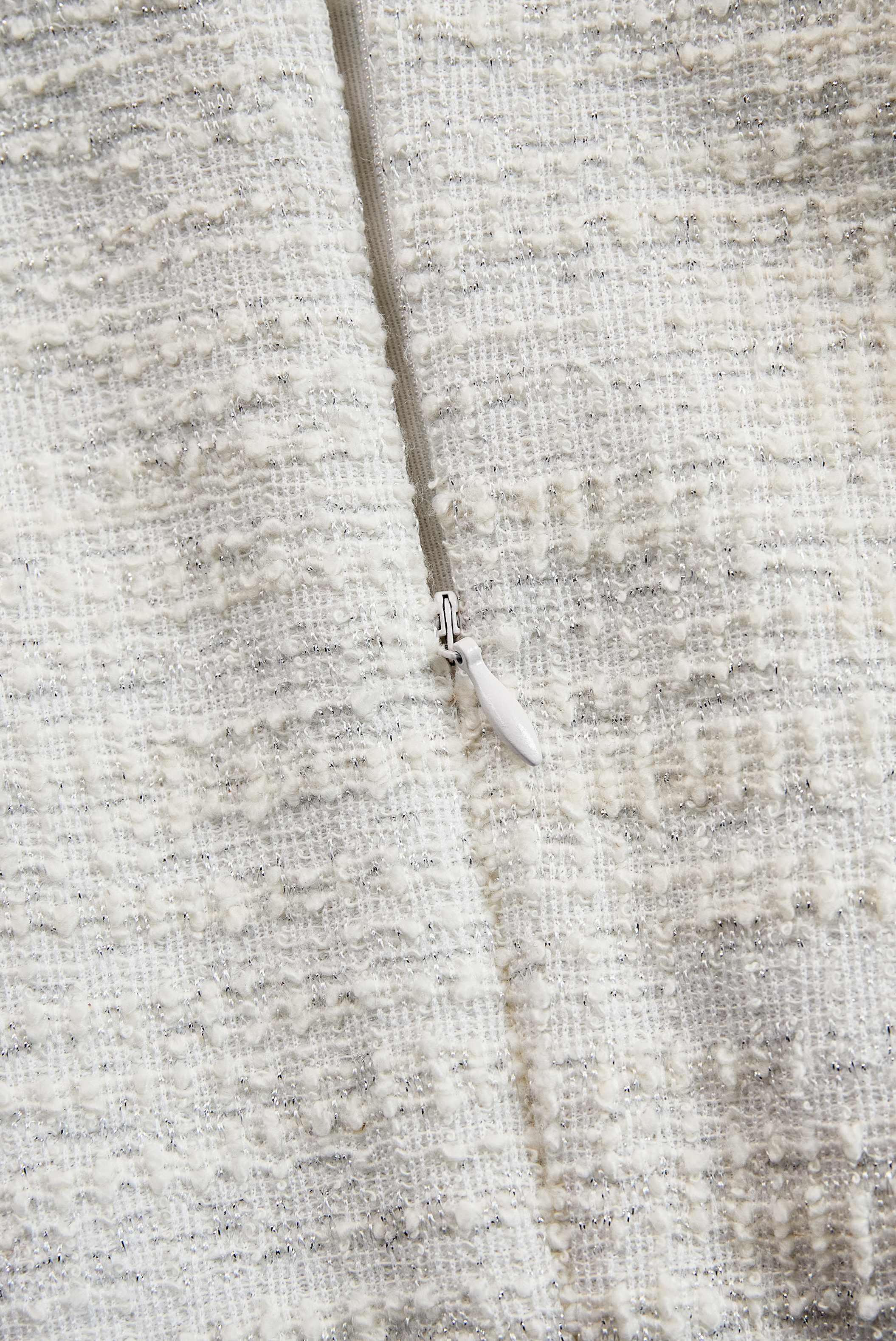 Mooyius unveils a refined expression of texture and movement with this ivory tweed fringe-tiered dress. Crafted with precision, the design highlights a slim, tailored silhouette balanced by cascading layers of fringe detailing that accentuate the skirt and waistline. The high neckline and long sleeves maintain a polished profile, while the tiered fringe adds depth, dimension, and a touch of playful elegance. Effortlessly blending structure with fluidity, this piece captures the essence of modern sophistication for the confident woman.