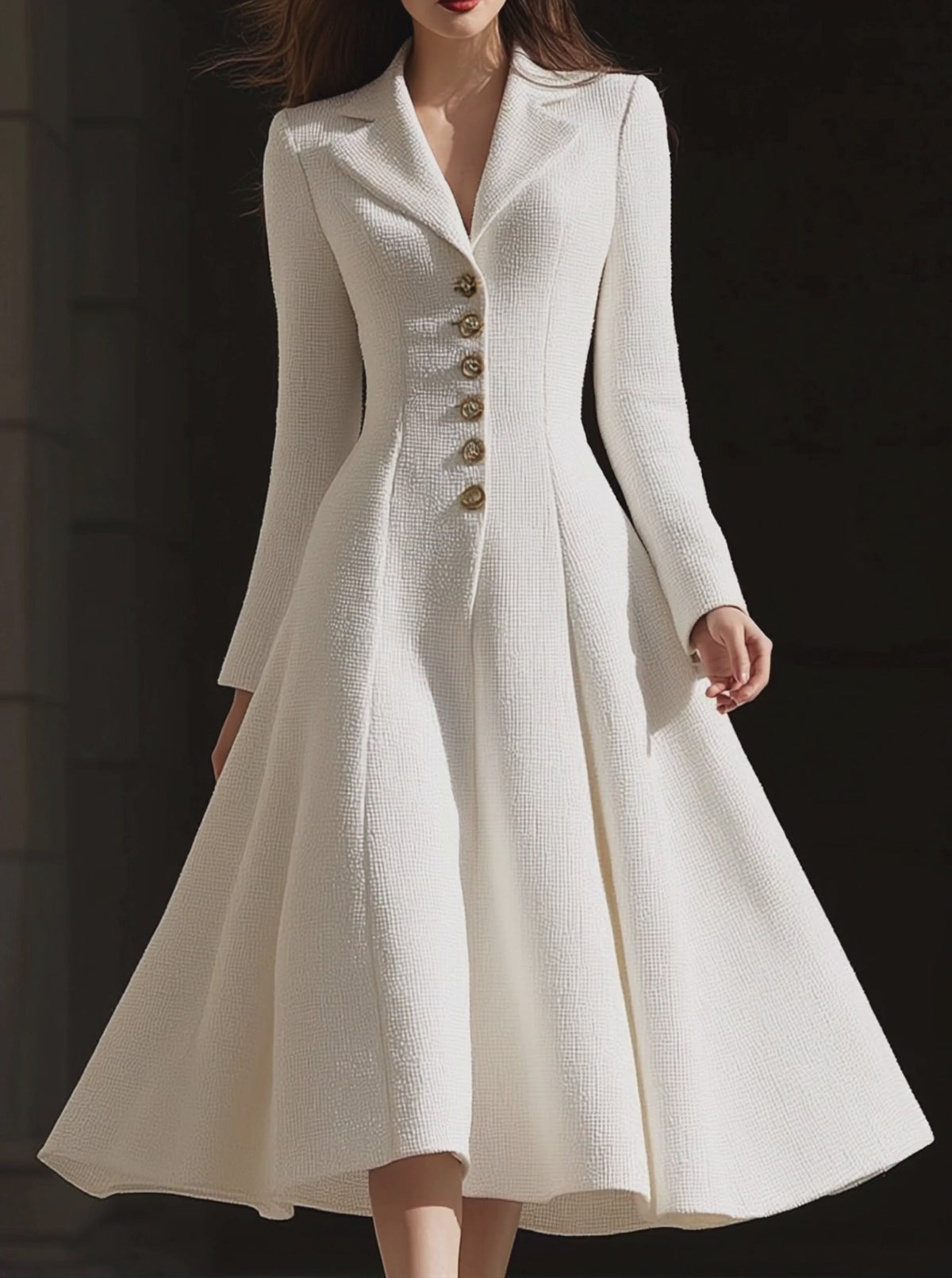 Ivory Tweed Tailored Lapel Midi Dress redefines sophistication with an emphasis on structure and grace. This dress is designed with a classic lapel collar and a sculpted bodice adorned with ornate gold buttons, creating a sharp yet feminine silhouette. Made from luxurious tweed, it is a piece that speaks of timeless refinement while offering durability and comfort during cooler months. The waist is cinched to flatter the figure, while the flared skirt brings movement and elegance.