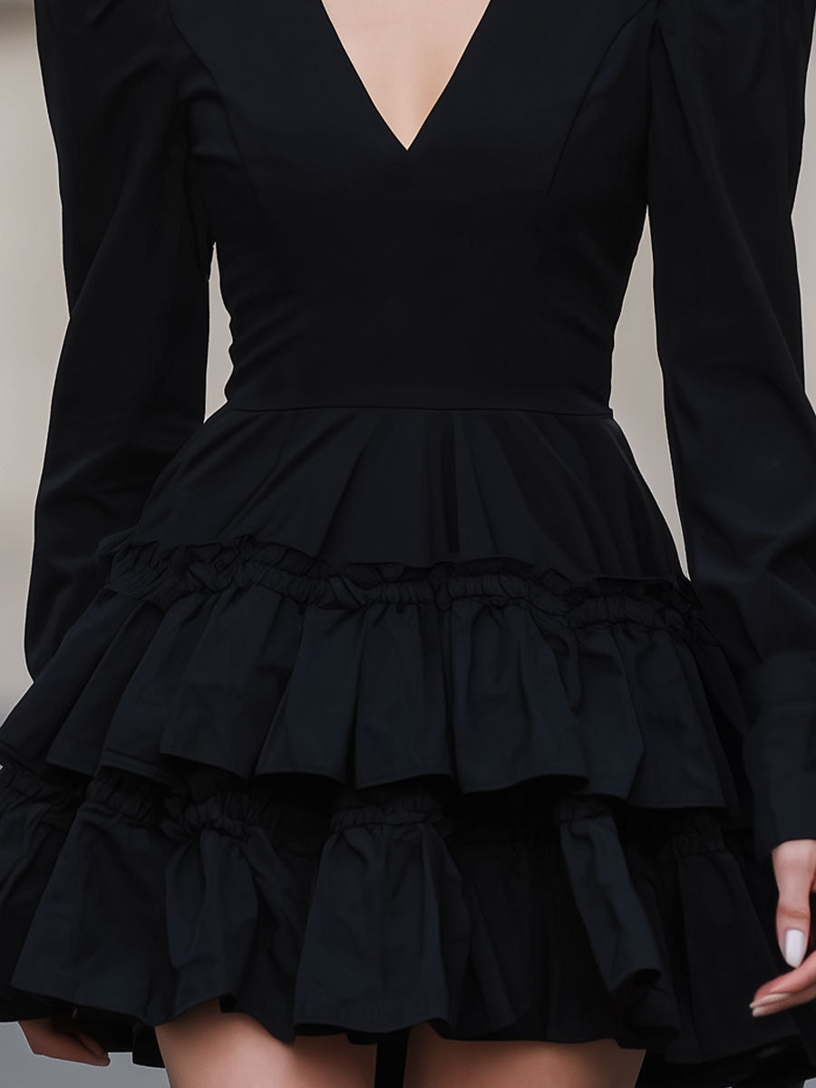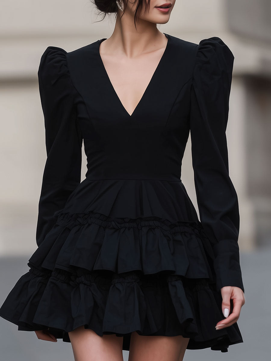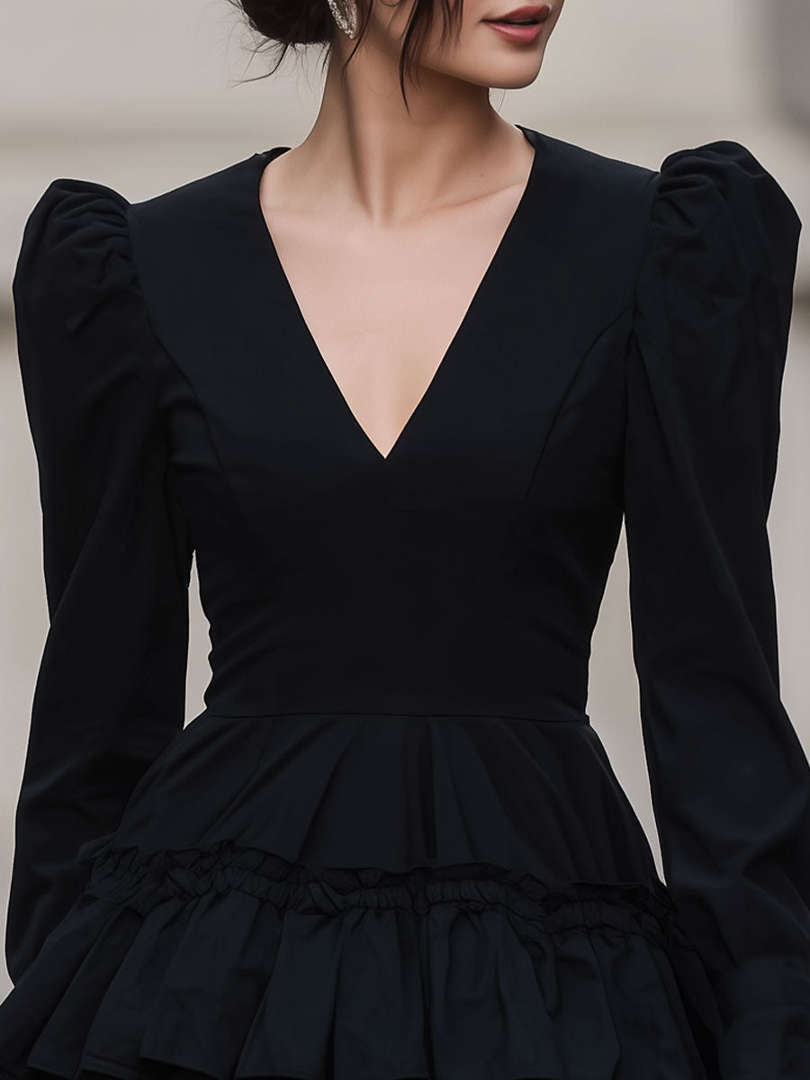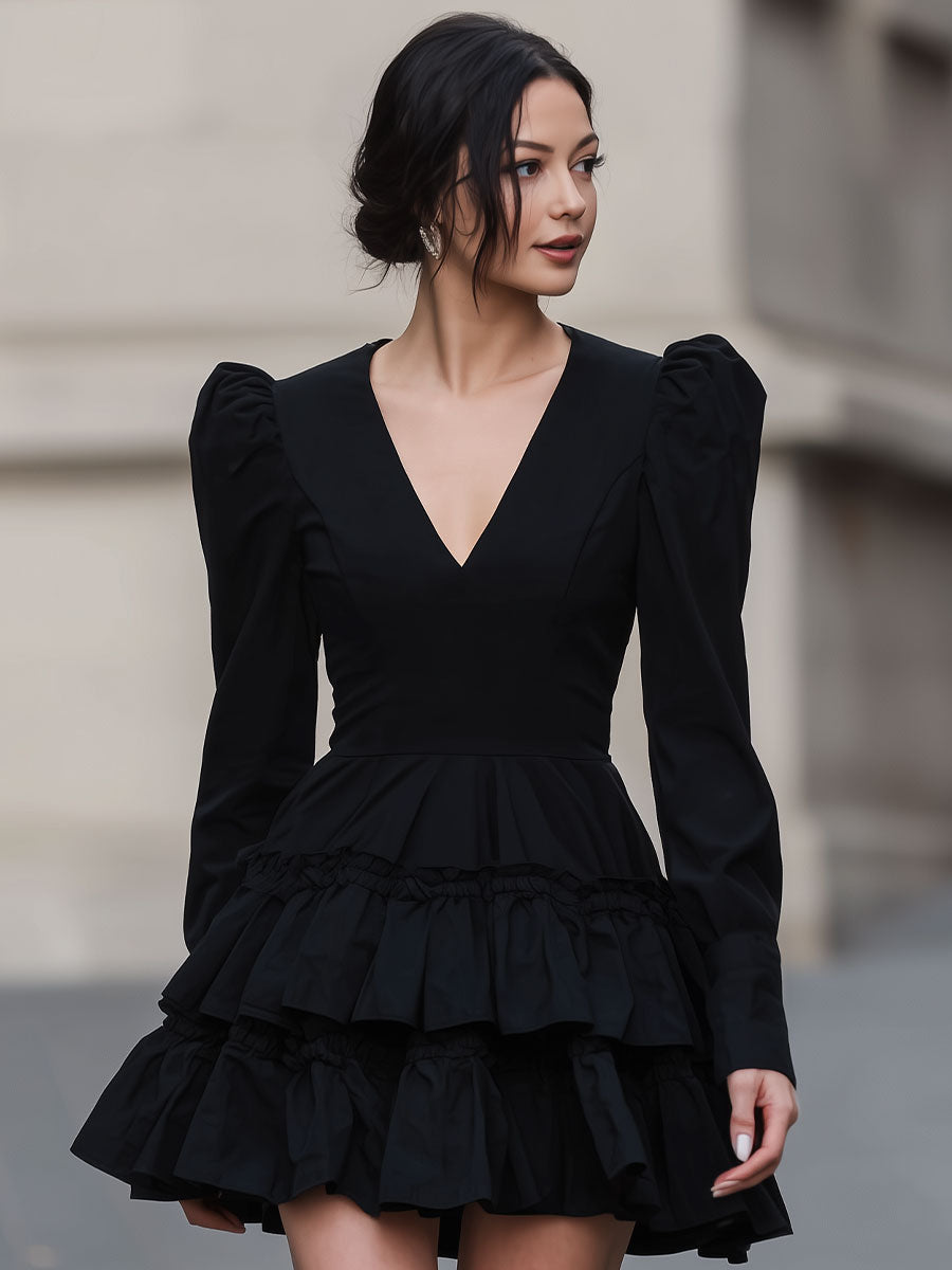 Mooyius Dramatic Black Puff-Sleeve Tiered Mini Dress