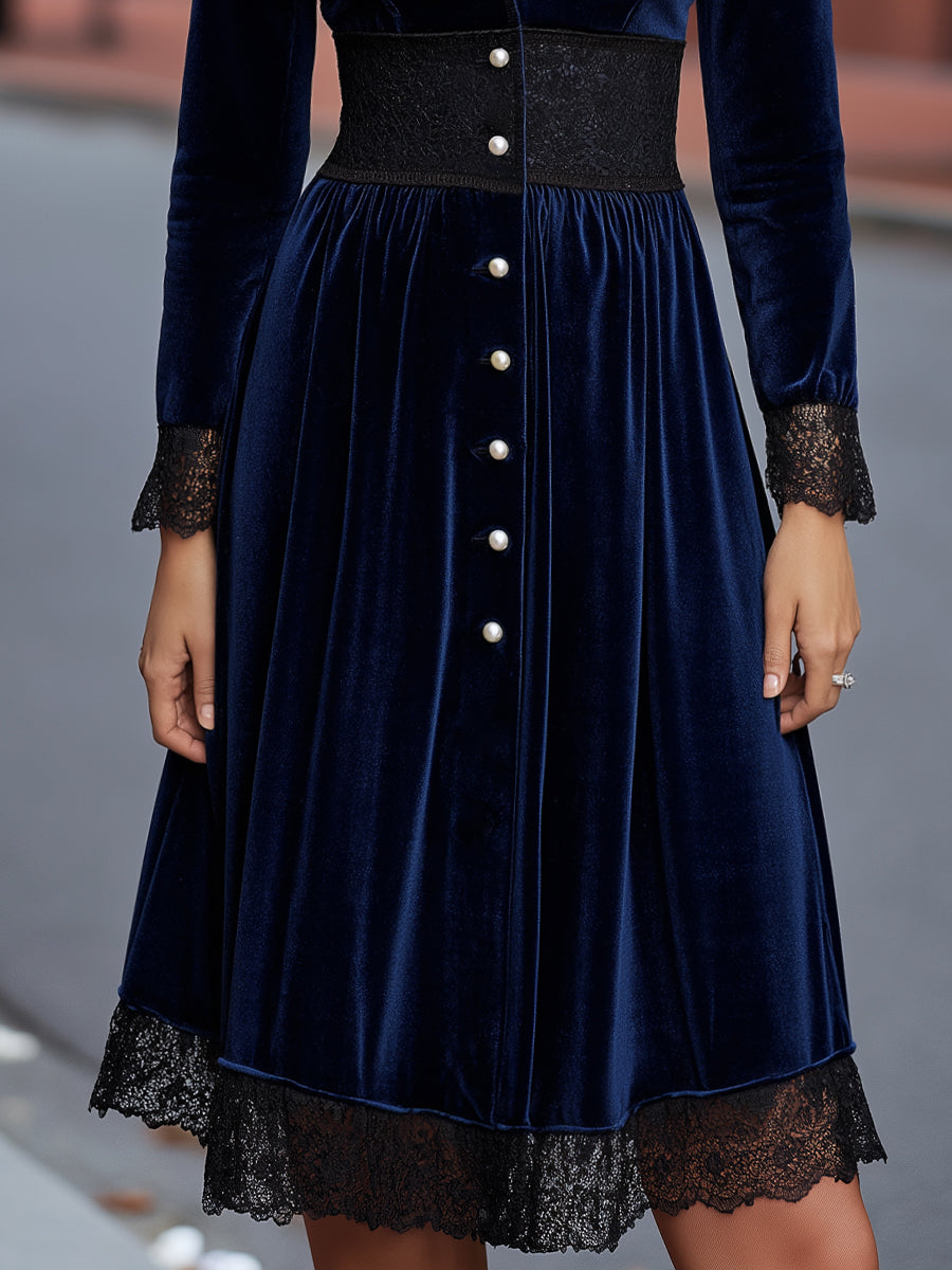 This Navy Velvet Lace-Trim Button-Front Midi Dress captures timeless elegance with a refined, feminine silhouette designed for elevated everyday wear and special occasions alike. Crafted with a luxurious velvet finish, the dress offers a soft sheen that enhances its deep navy tone, creating a rich and sophisticated visual appeal under natural or evening light.
