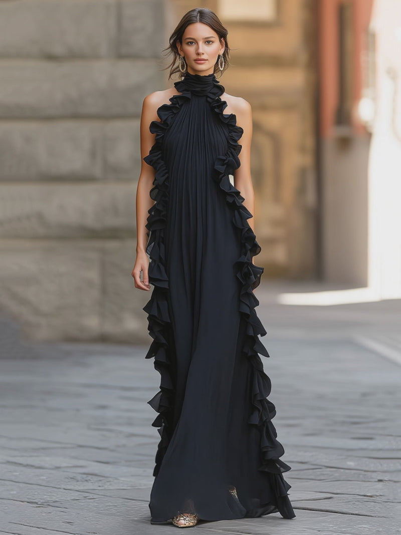 Midnight Elegance Ruffled Halter Pleated Chiffon Maxi Gown