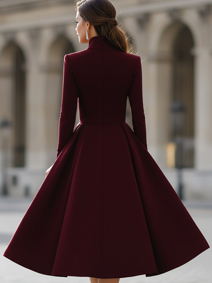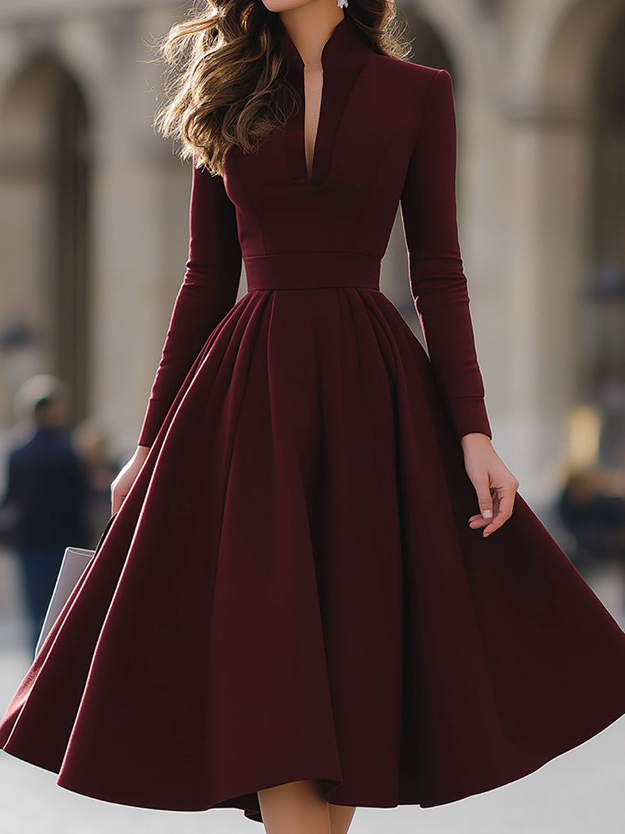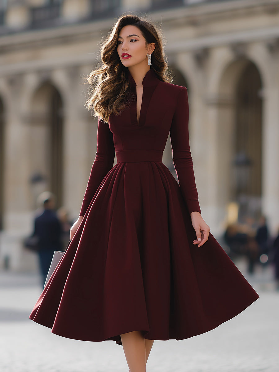 Mooyius presents an elegant burgundy midi dress, designed with a flattering V-neckline and a voluminous full skirt. This dress combines timeless sophistication with modern appeal, perfect for formal occasions or evening events.