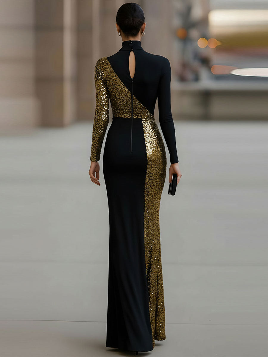 Elegant Black And Gold Sequin High-Neck Slit Maxi Dress