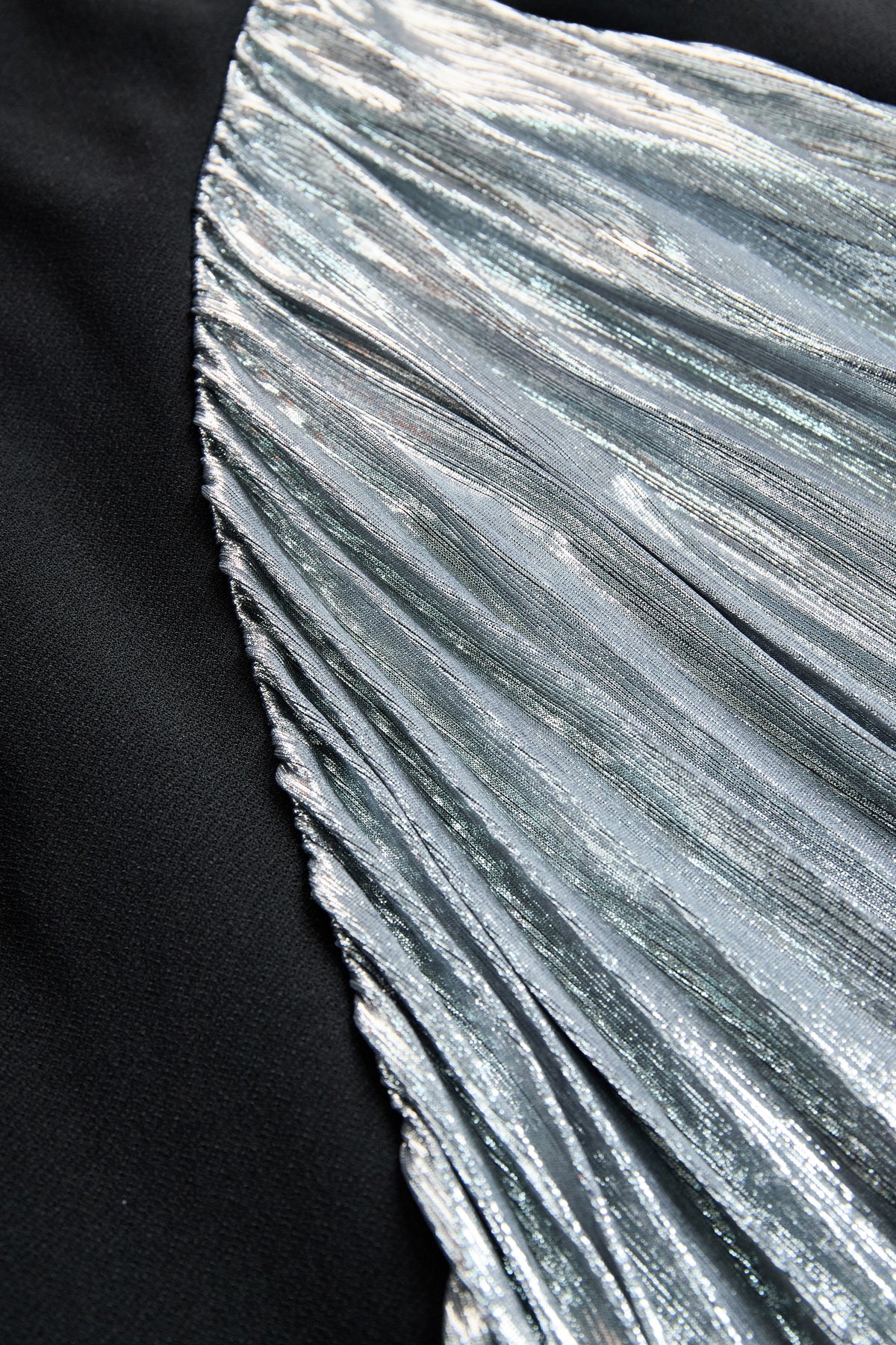 - Design: Deep V neckline; asymmetric gathered waist; hidden metallic pleated panel; thigh-high slit
