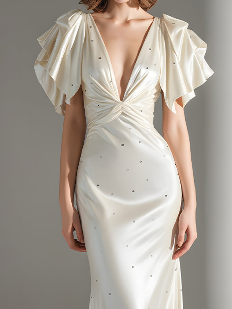 Ivory Crystal-Dot Gown With Ruffled Butterfly Sleeves And Deep-V Bodice