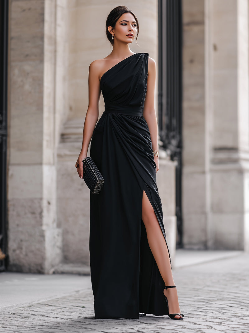 One-Shoulder Draped High-Slit Evening Maxi Dress