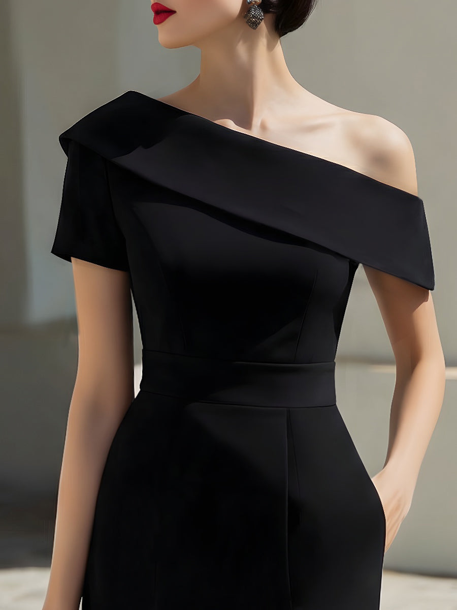 The dress features a distinctive off-shoulder neckline that sweeps diagonally across the collarbone, creating an elegant asymmetric frame that highlights the shoulders and neckline. One side is finished with a soft, structured sleeve that balances the design while adding sculptural dimension. The folded neckline detail enhances the clean lines of the bodice, delivering a polished and contemporary look.