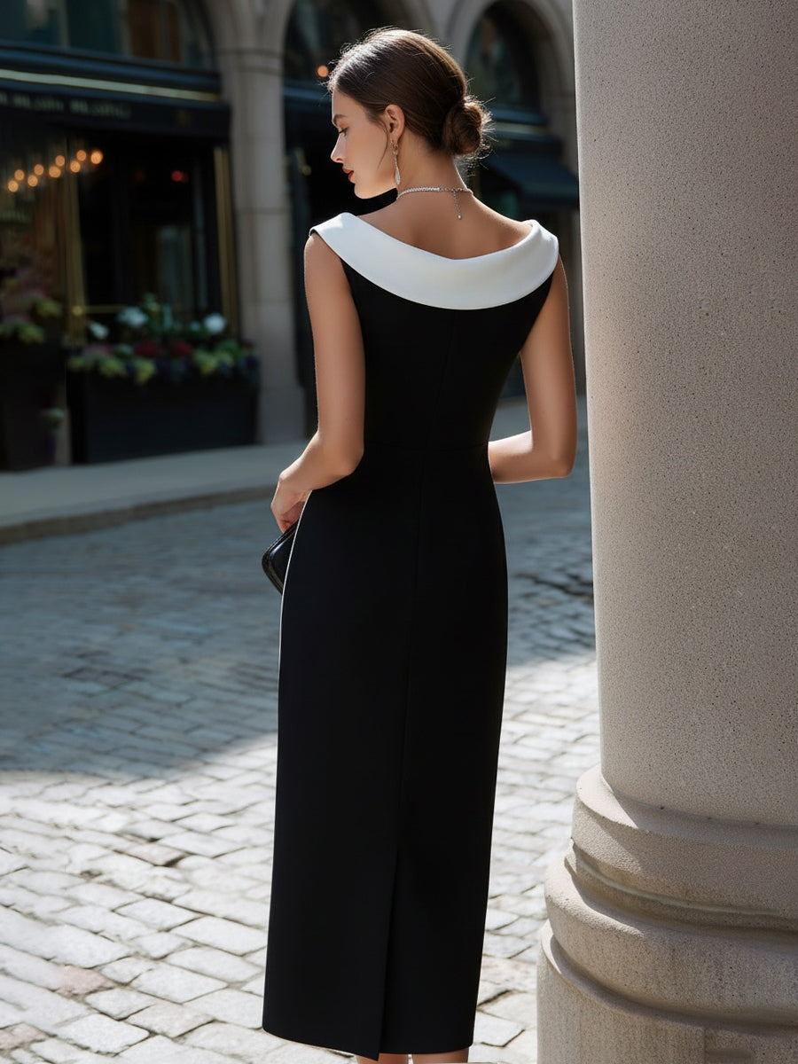 Mooyius presents a refined sleeveless midi dress designed to express timeless elegance through minimalist lines and subtle contrast detailing. This piece features a softly curved contrast neckline that gently frames the collarbone and shoulders, creating a graceful focal point with understated sophistication. The sleeveless cut highlights the arms and upper body, offering a clean and elongated silhouette ideal for polished styling. The bodice is smoothly contoured to follow the natural shape of the waist and hips, delivering a streamlined, column-like profile without excess structure. Falling to a classic midi length, the skirt maintains a fluid, uninterrupted line that enhances vertical proportions and exudes quiet confidence.