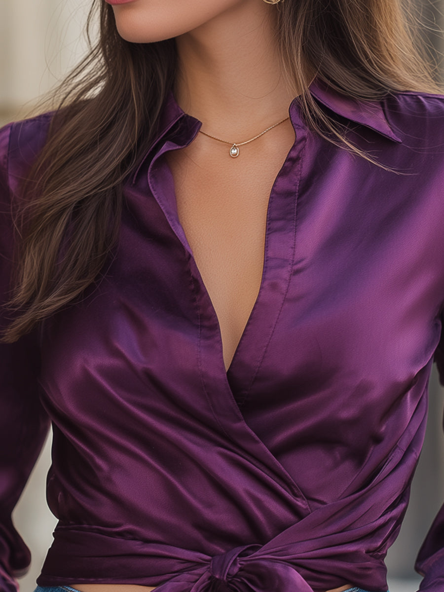 Bold, feminine, and effortlessly polished, this deep plum satin wrap top brings elevated luxury to modern city style. The wrap silhouette embraces the waist with beautifully tailored draping, ensuring a flattering fit for every figure. The lustrous satin fabric catches light with an enchanting sheen, revealing richness in texture that enhances its visual depth.